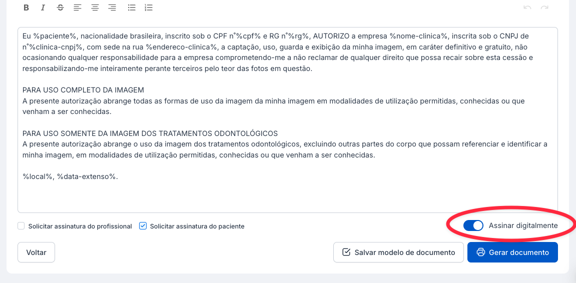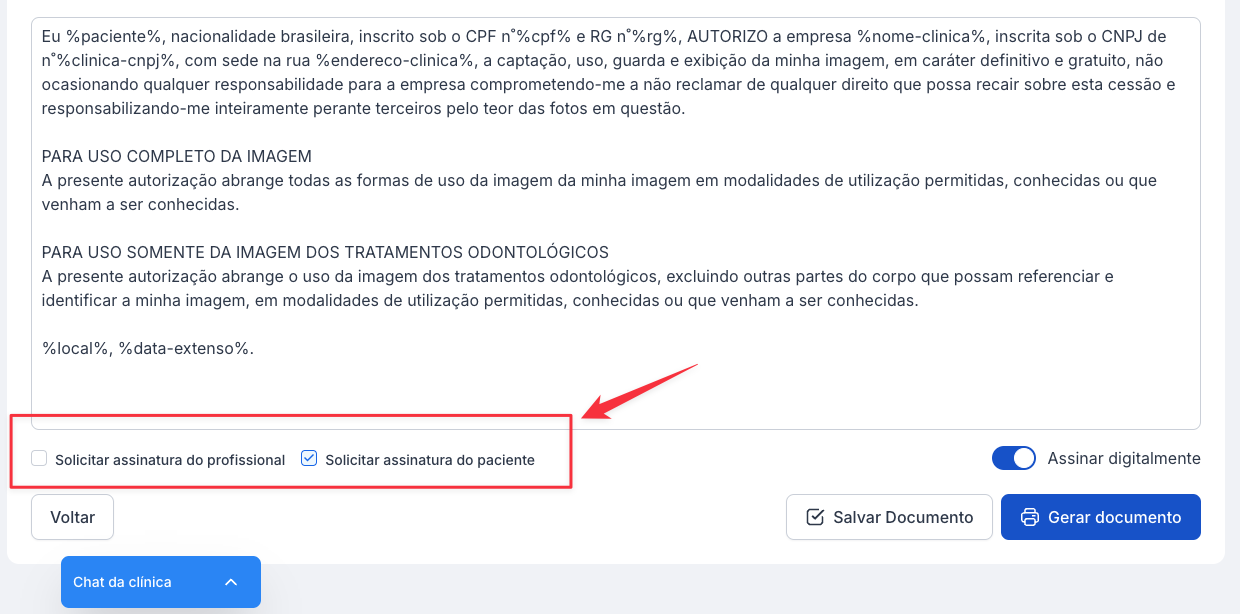 Somente o paciente: usado para autorizações, como uso de imagem ou consentimento de procedimento.