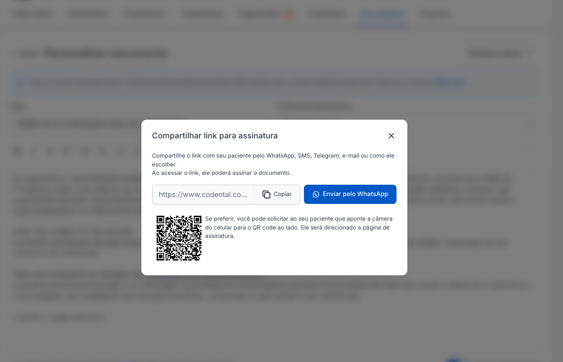 O sistema permite que você envie o link ao paciente por WhatsApp, peça ao paciente para escanear o QR Code, ou copie o link para enviar como quiser.