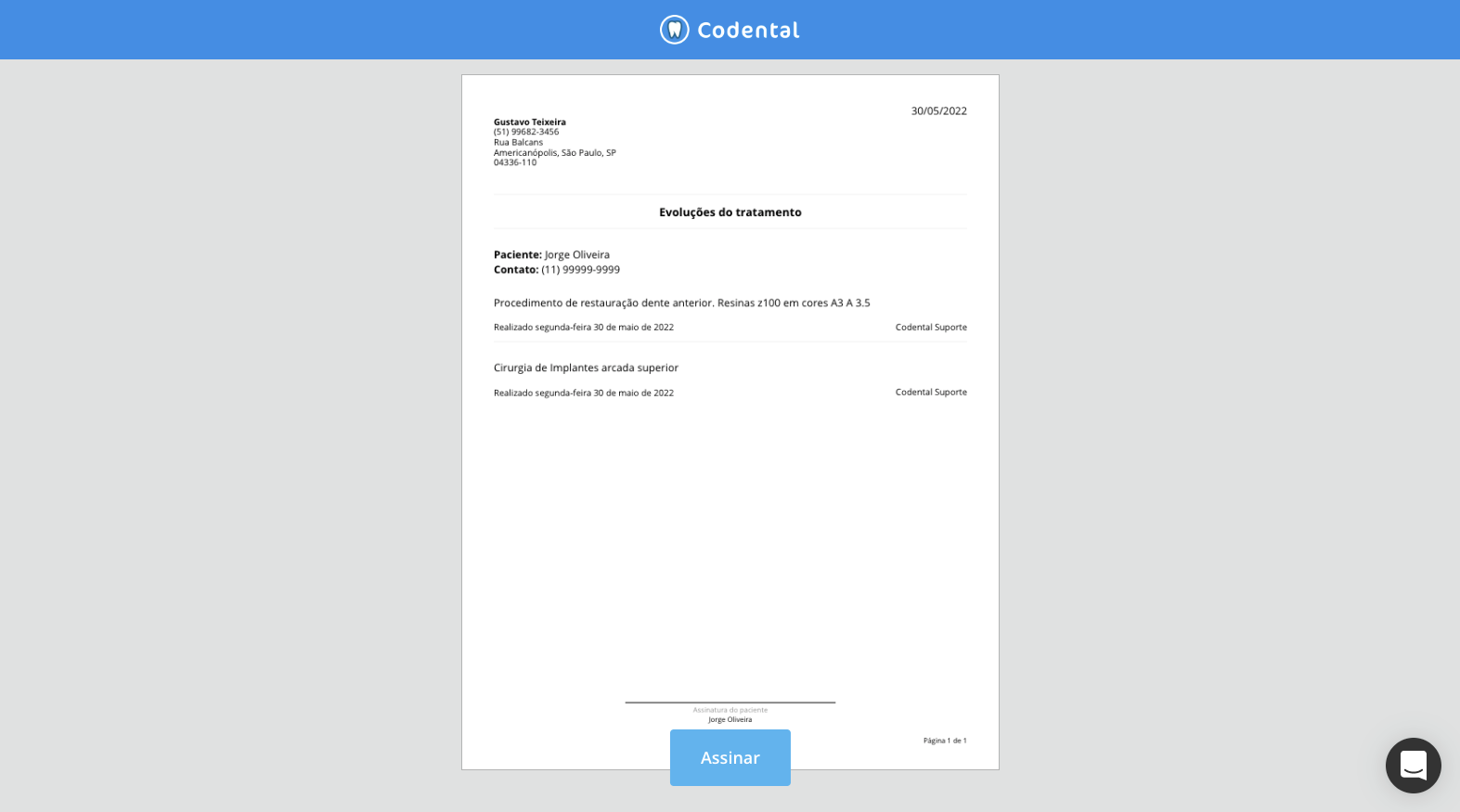 É essencial que o paciente assine pelo dispositivo dele. O Codental registra o IP e a geolocalização para comprovar que foi o paciente que fez a assinatura, então não permita que ele use o aparelho da clínica, para evitar questionamentos futuros.