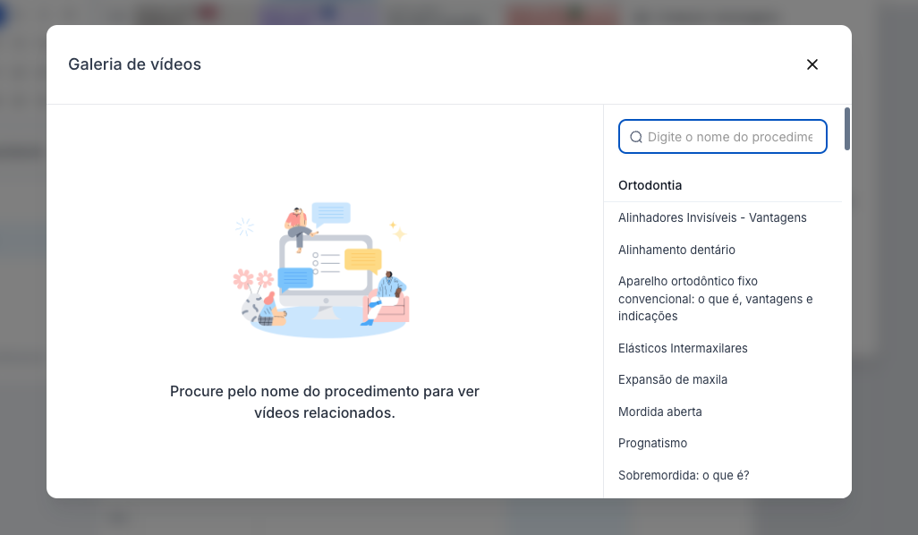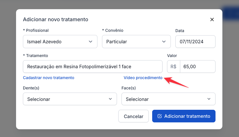 Além da biblioteca principal, você também pode acessar os vídeos explicativos diretamente na ficha do paciente ao adicionar um tratamento.