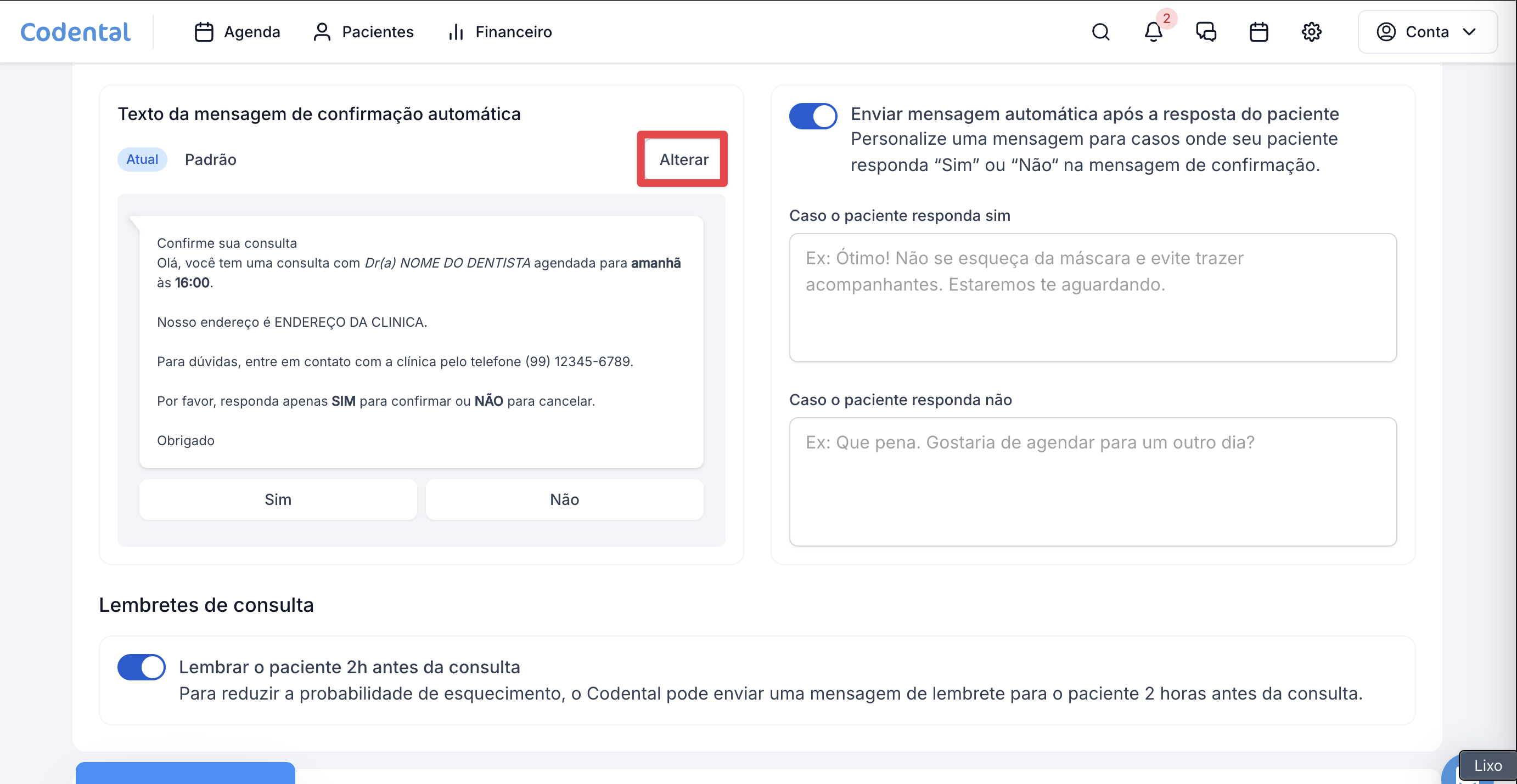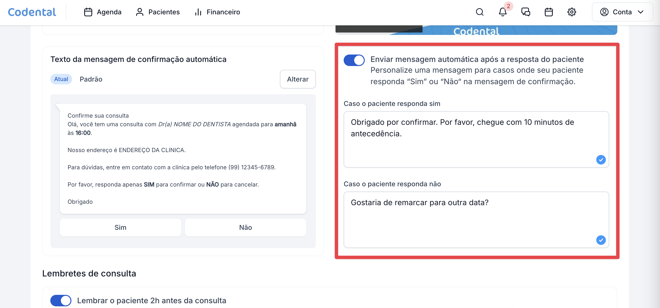 Aprenda a ativar, desativar e ajustar a confirmação automática das consultas no Codental, definindo dias de envio, modelos de mensagens e lembretes extras.