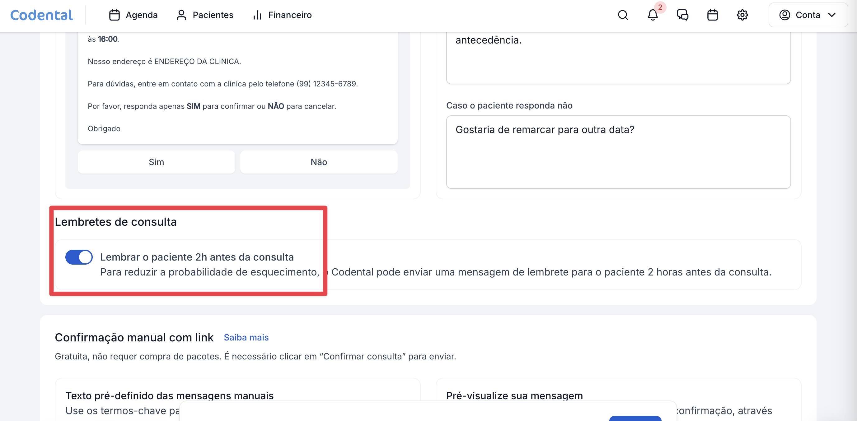 Mais abaixo, você também pode ativar um lembrete enviado 2 horas antes da consulta. Esse lembrete ajuda o paciente a não esquecer o compromisso.