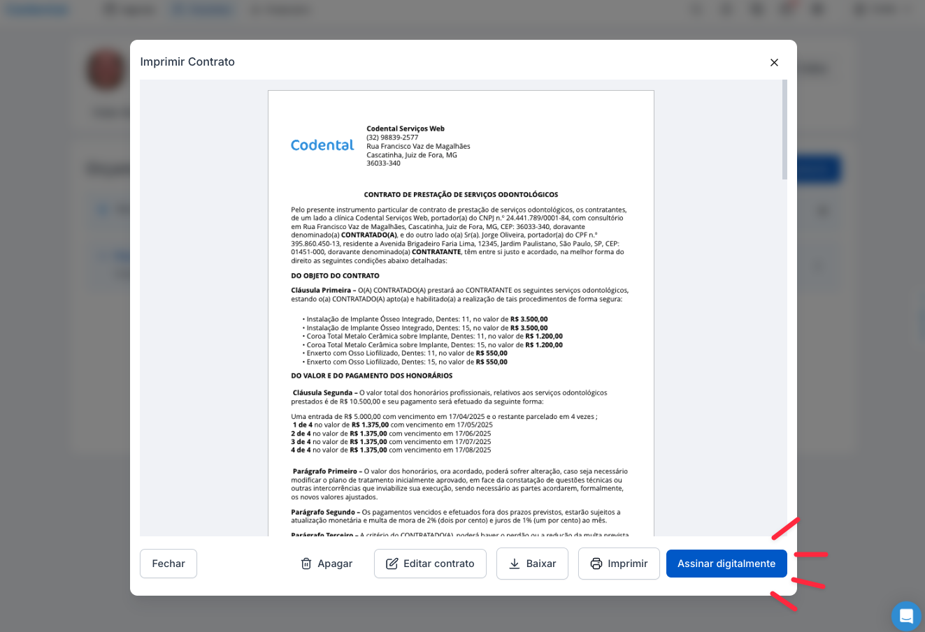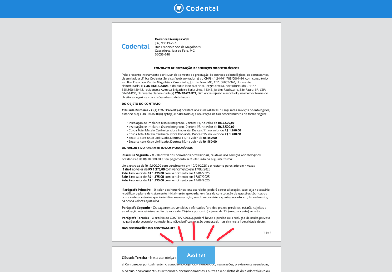 Assinar contratos odontológicos digitalmente no Codental traz mais agilidade, economia de papel e segurança jurídica para o seu consultório. Com poucos cliques, você formaliza acordos com pacientes de forma 100% digital e legalmente válida.