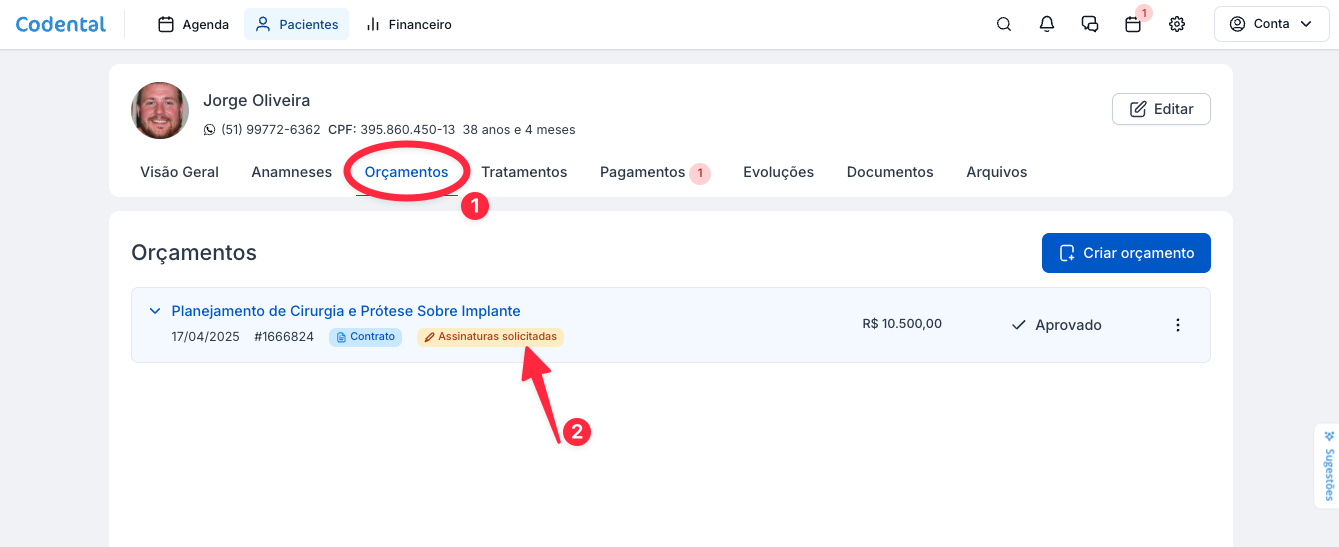 1. Vá até o menu Orçamentos no prontuário do paciente.
