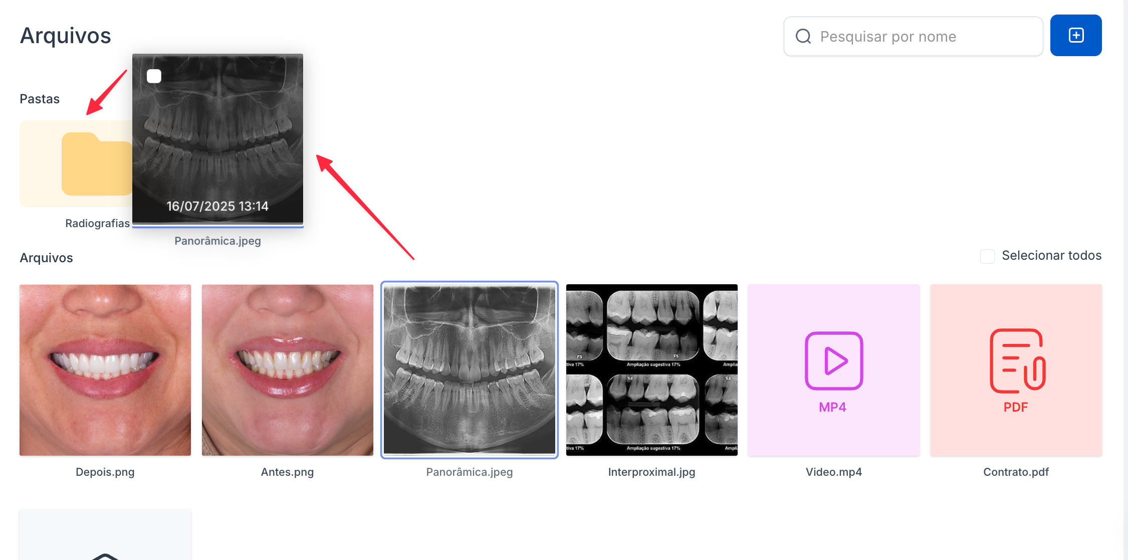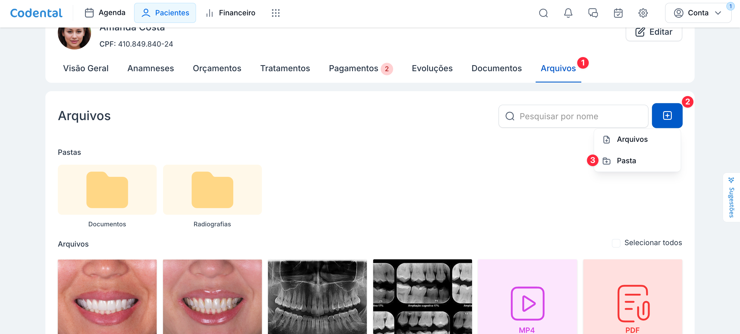 Com o volume crescente de fotos, exames e documentos na ficha do paciente, manter tudo organizado pode ser um desafio. Por isso, o Codental permite criar pastas personalizadas para agrupar esses arquivos e facilitar sua localização. Você pode separar conteúdos por tipo, como “exames”, “fotos de antes e depois”, “documentos assinados”, entre outros.