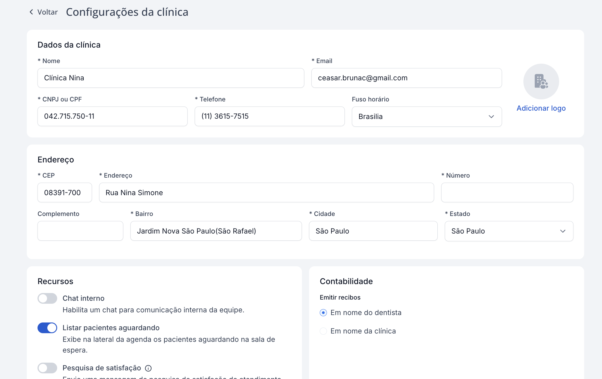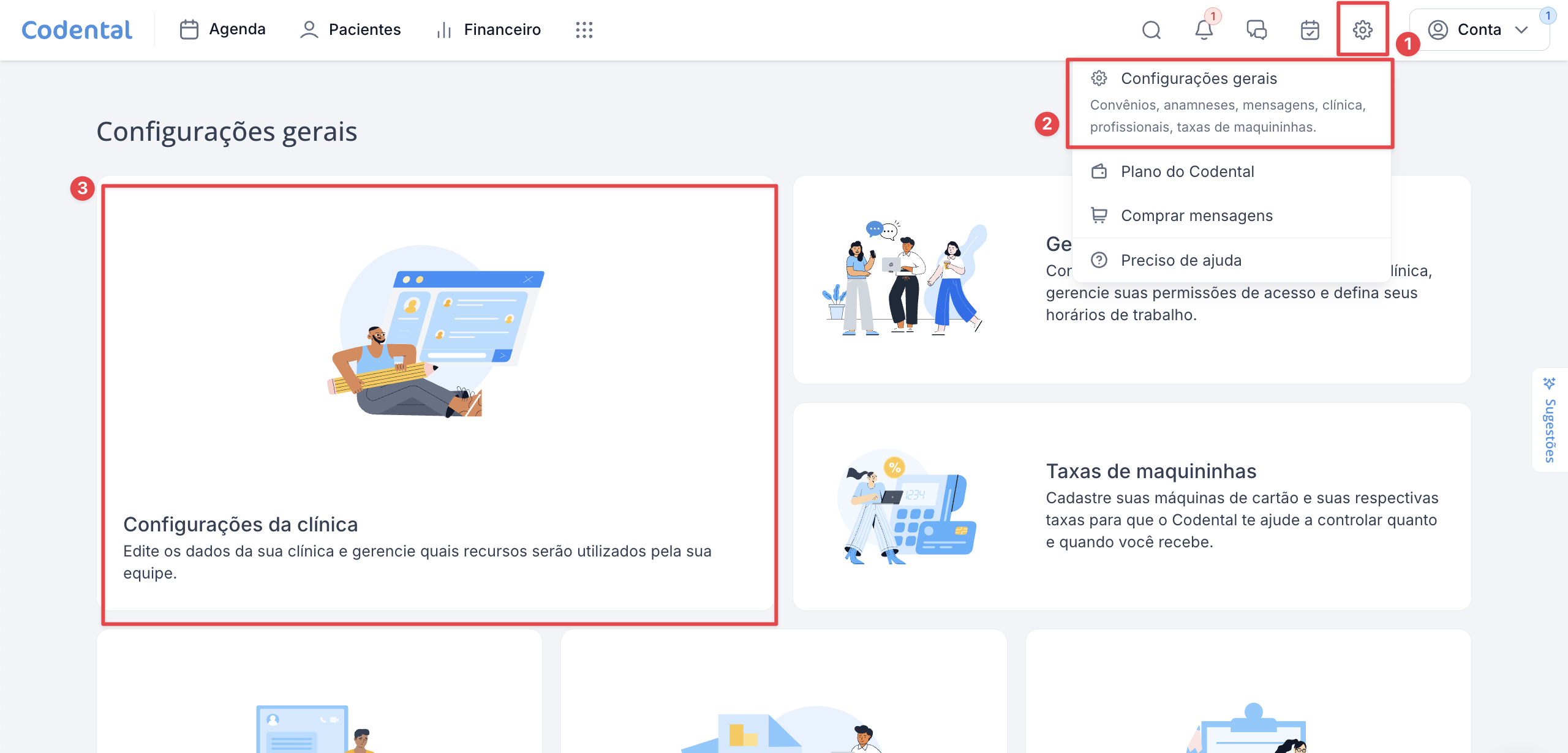 Acesse sempre que necessário a área de configurações da clínica e mantenha tudo em dia.