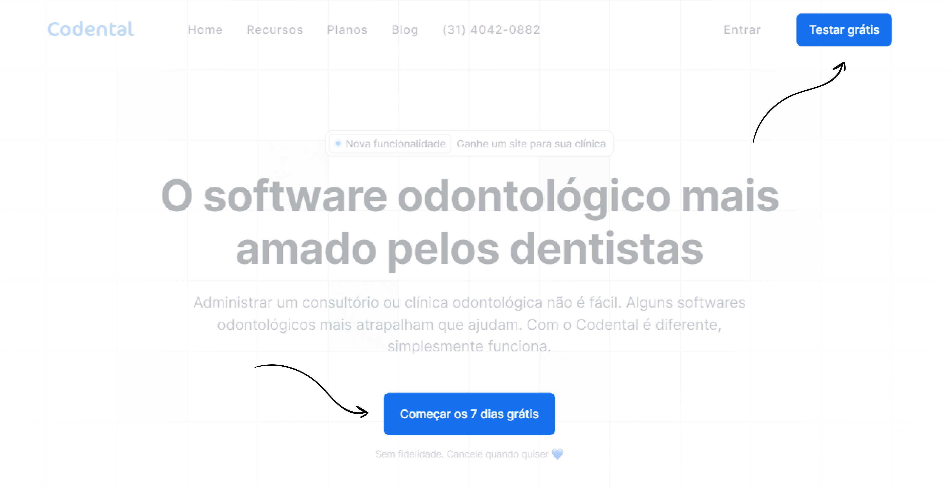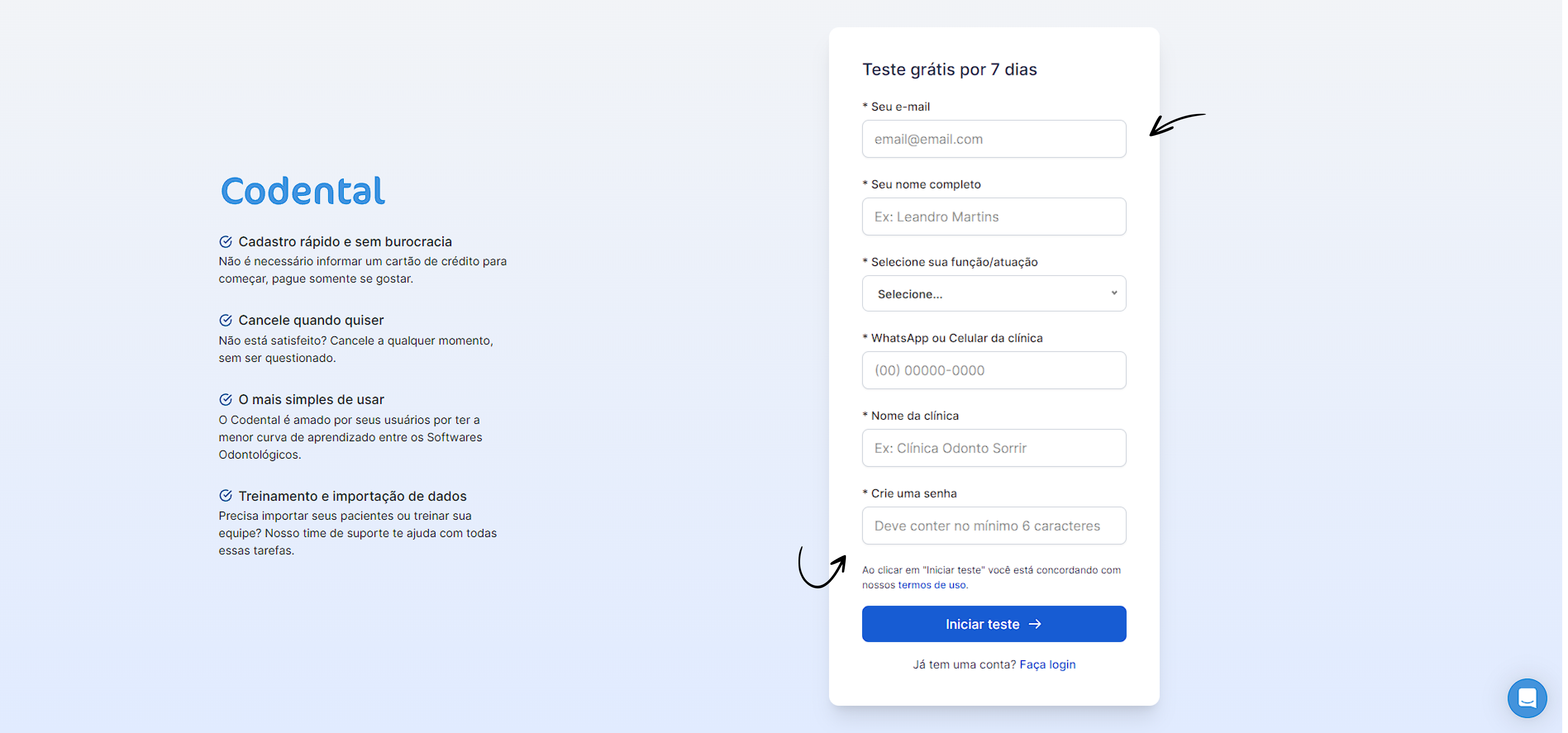 Acesse a Página inicial do Codental e depois clique em Testar grátis. A página vai redirecionar para a sessão de registro.