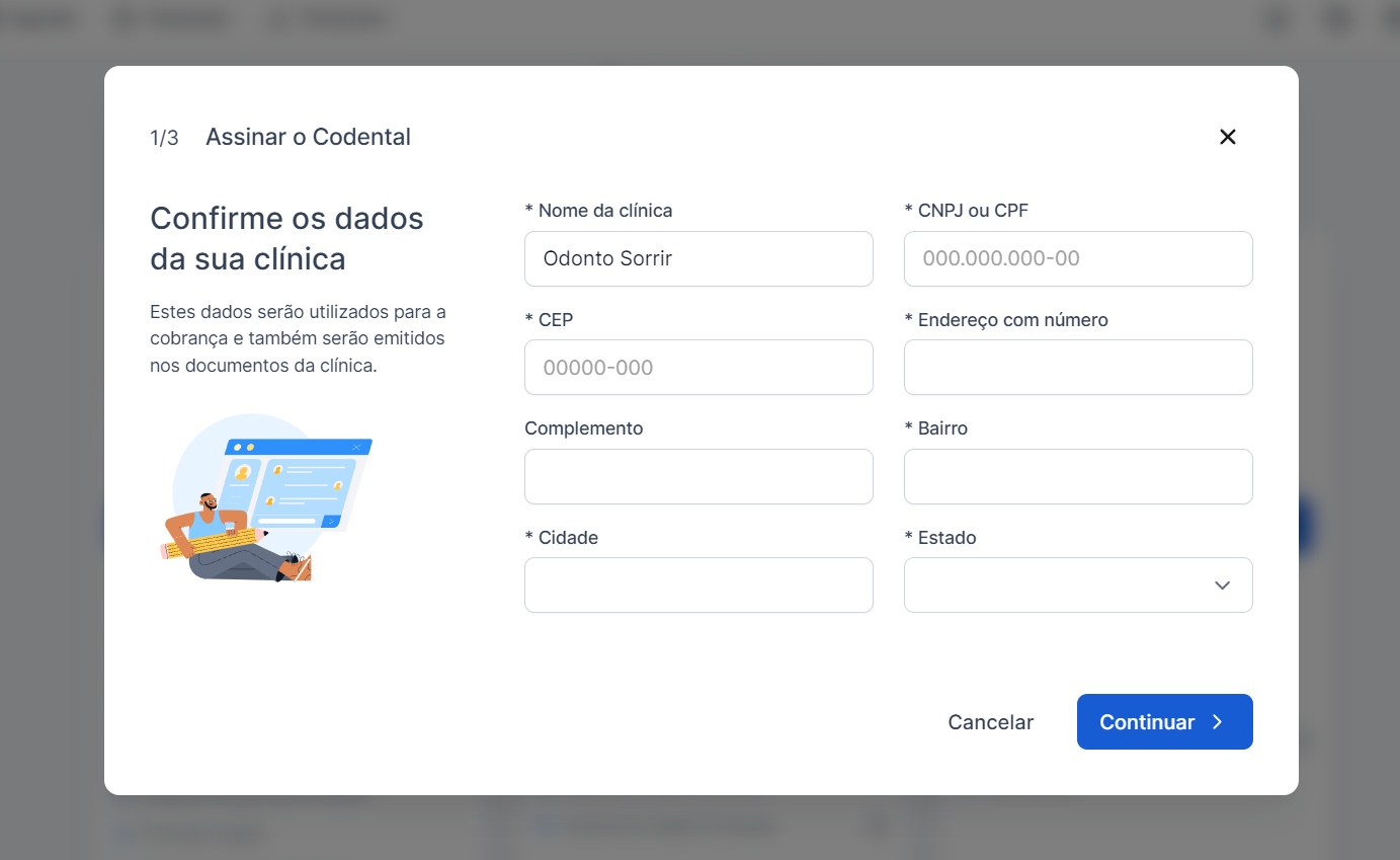 Passo 3: Complete as informações da sua clínica ou consultório, caso você já tenha preenchido, esse passo será pulado automaticamente. Após concluir é só clicar em "continuar".