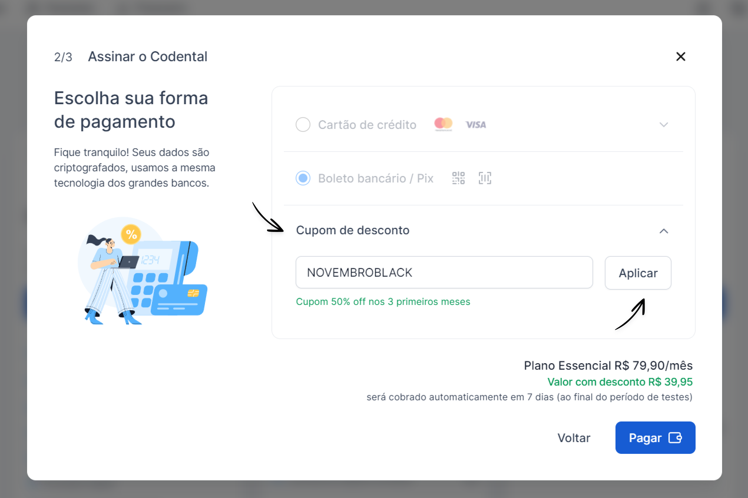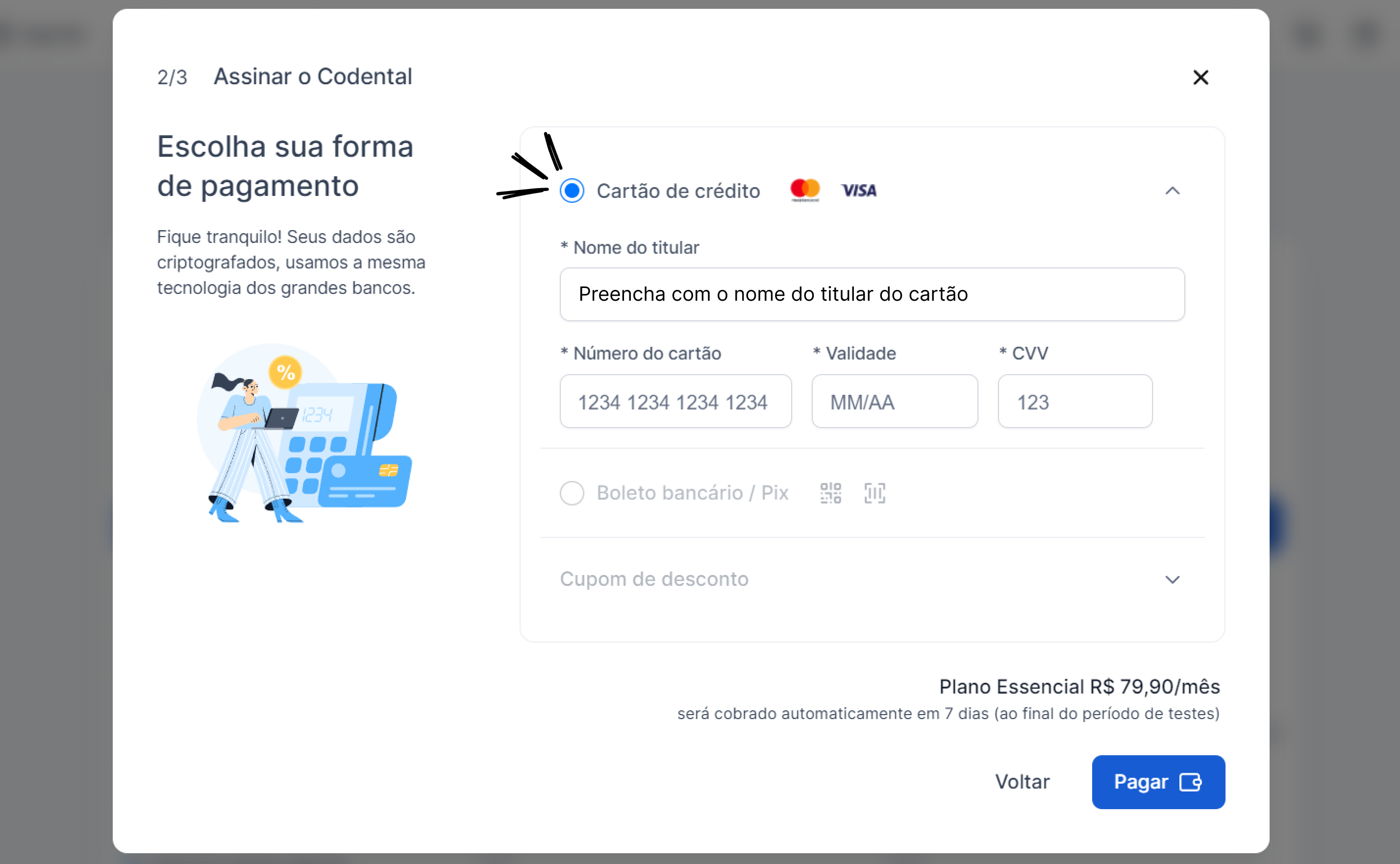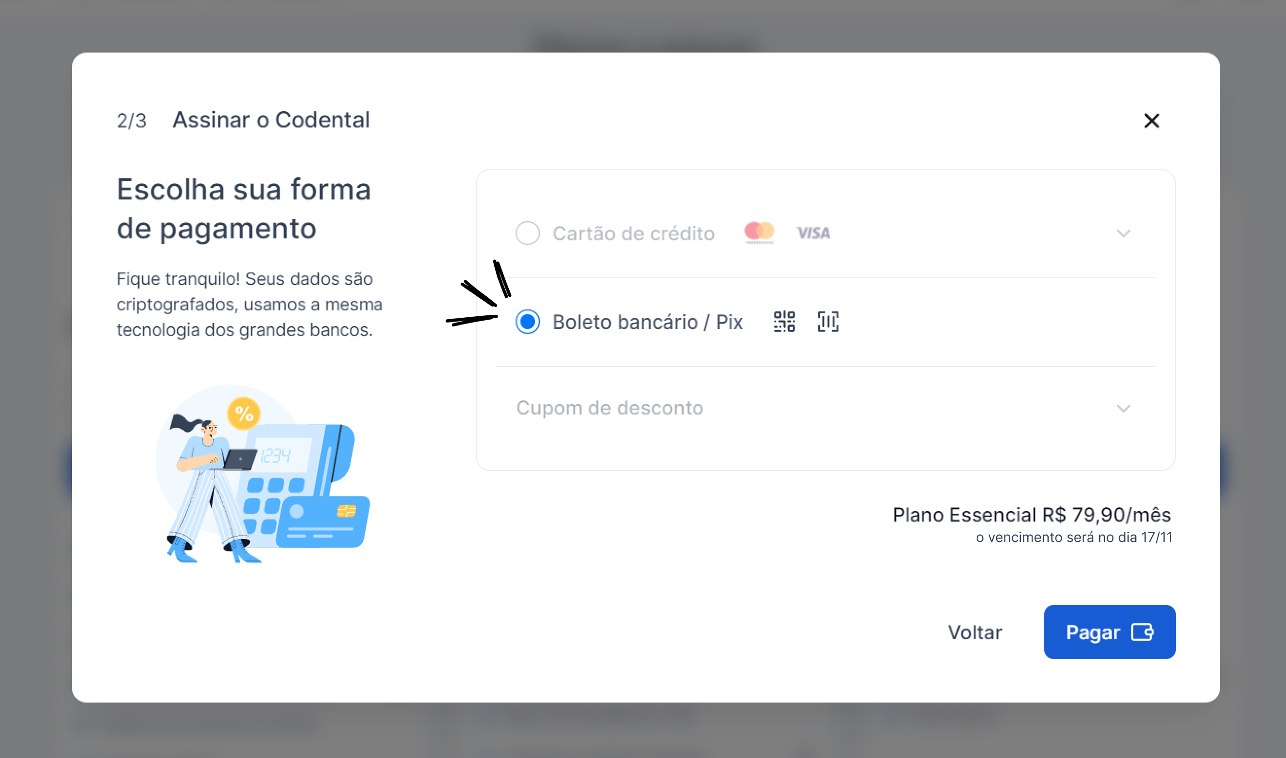 Saiba como assinar o Codental no cartão de crédito ou boleto bancário/pix.