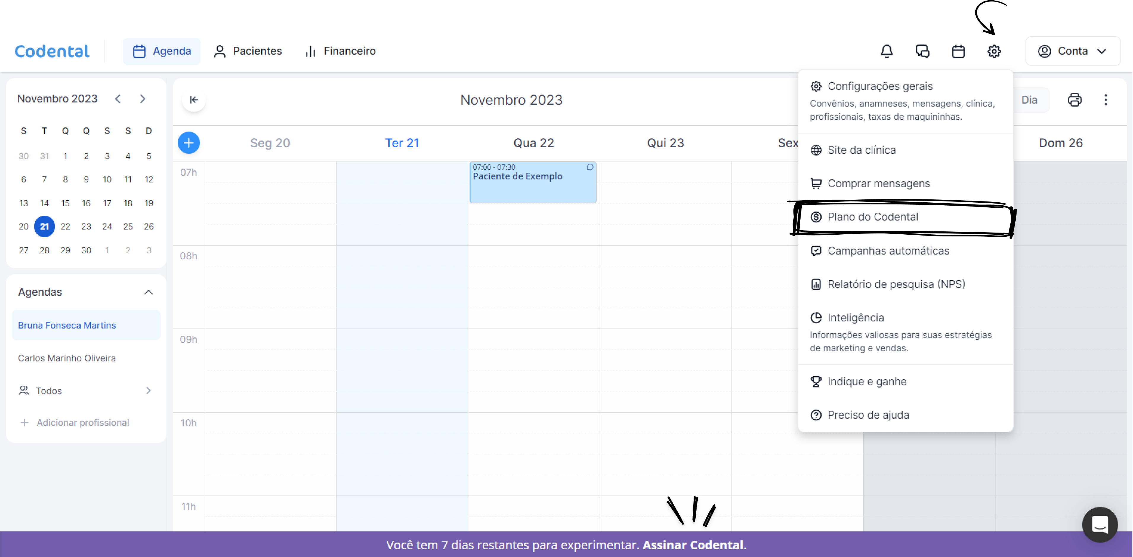 Passo 1: Você vai acessar o menu de configurações e selecionar a opção "Plano do Codental" ou clicar sobre a faixa ao final da tela