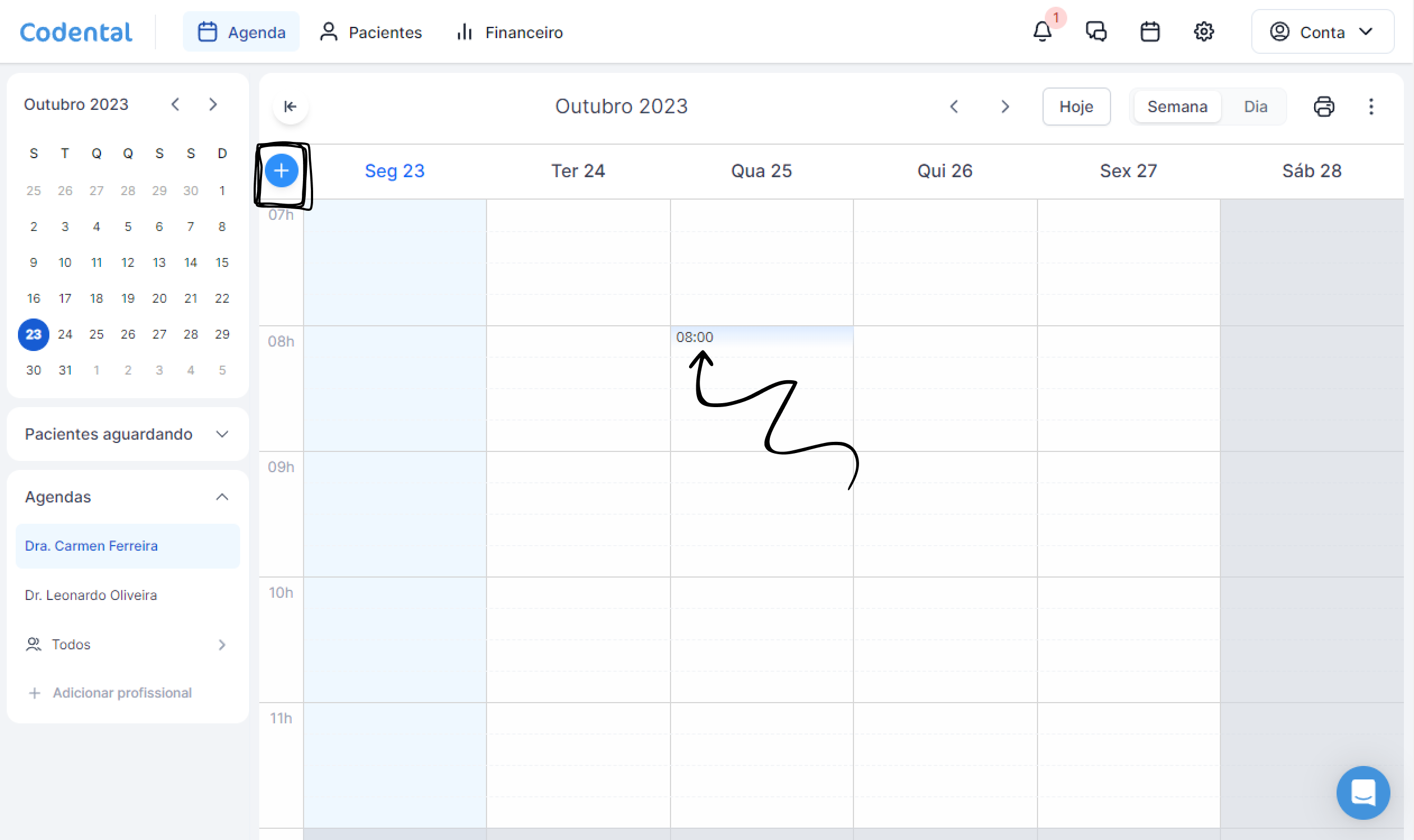Ao passar o mouse sobre a grade da agenda, os horários serão destacados. Basta clicar em um horário disponível ou no ícone "+" para iniciar o agendamento.