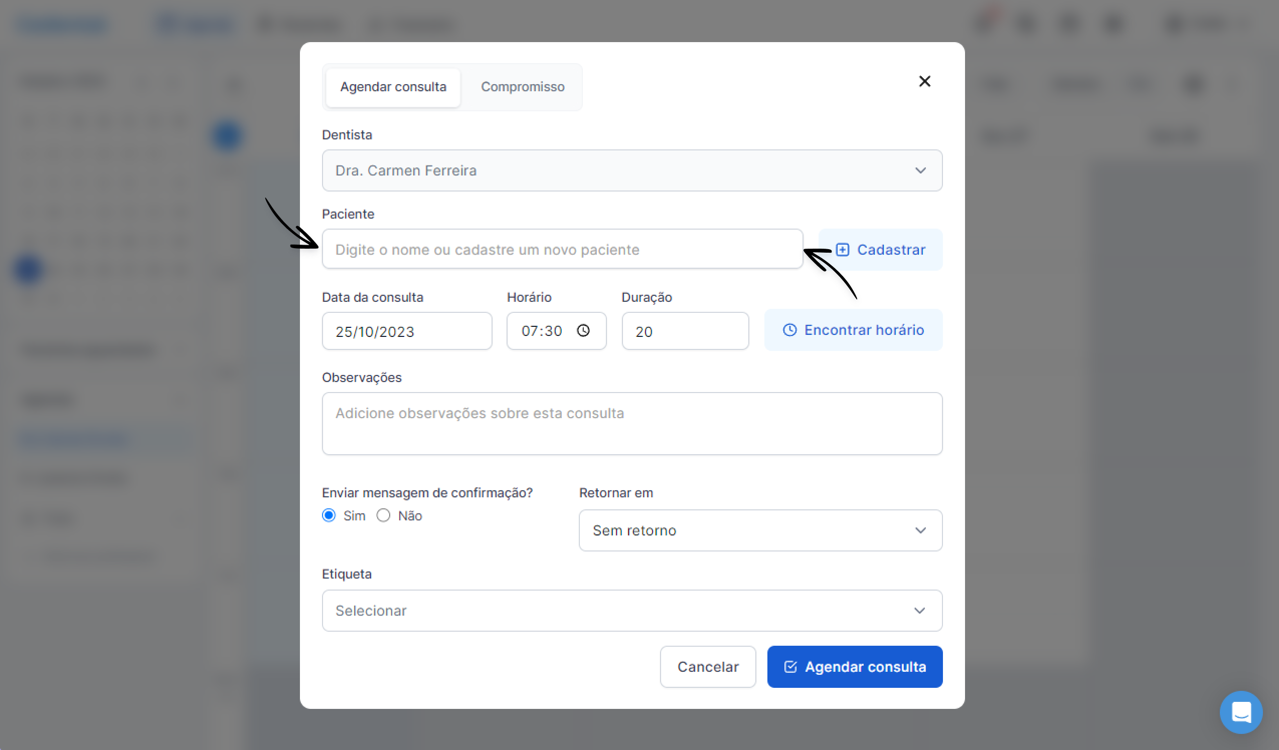 Ao clicar no horário desejado, a janela de agendamento será exibida, permitindo que você defina todos os detalhes da consulta:
