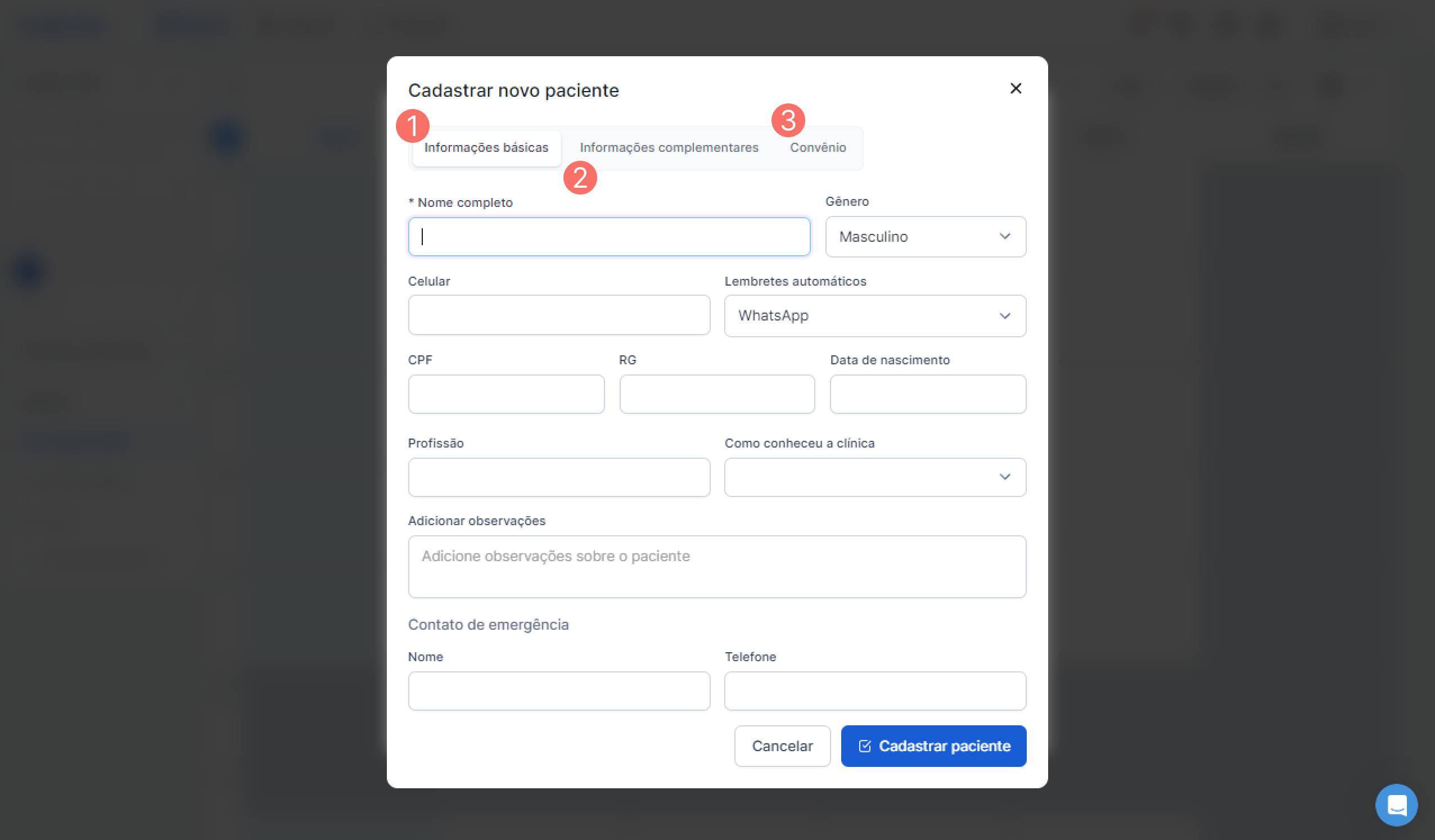 Informações básicas: Nome, data de nascimento, documentos, celular, preferência de recebimento do lembrete, profissão, como conheceu a clínica, observações e contato de emergência.