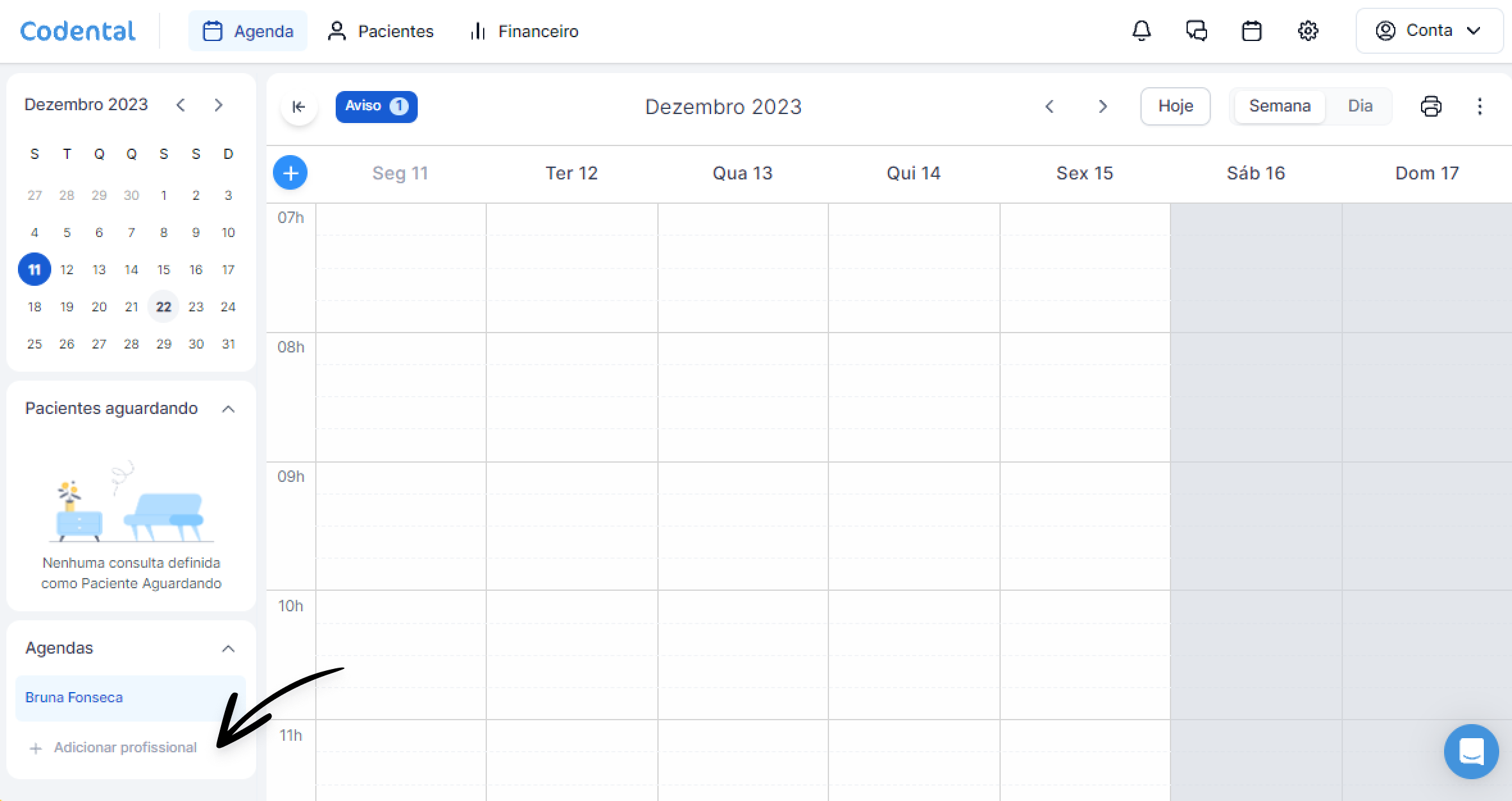 1. Adicionar Profissional: No lado esquerdo da sua agenda, você encontrará um botão "Adicionar profissional".