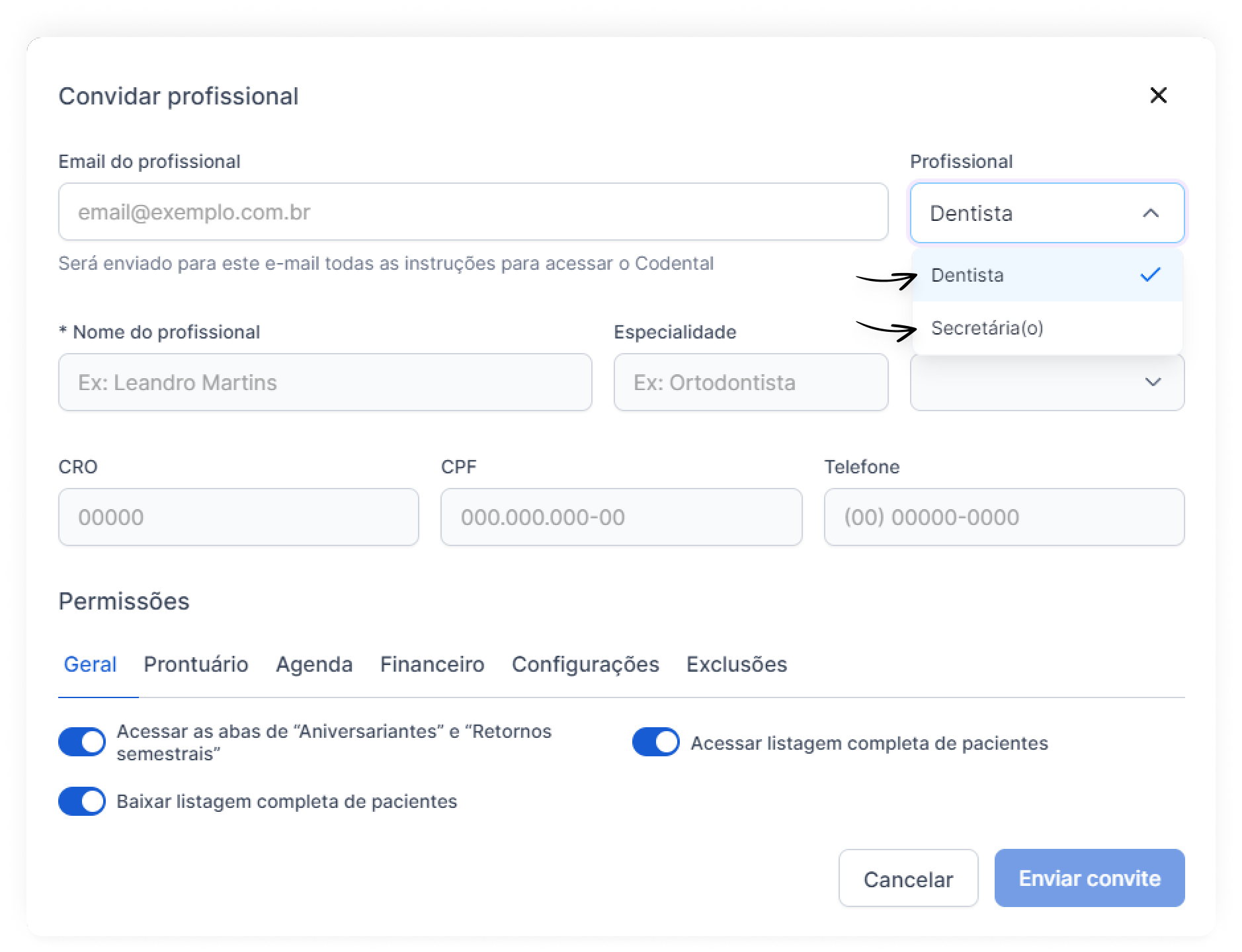 Permissões Personalizadas: Ajuste o que cada usuário pode acessar ou alterar. Por exemplo, impeça que um dentista altere a agenda de outro ou que a secretária acesse relatórios financeiros. No futuro, consulte Como editar as permissões para ajustar facilmente essas configurações.