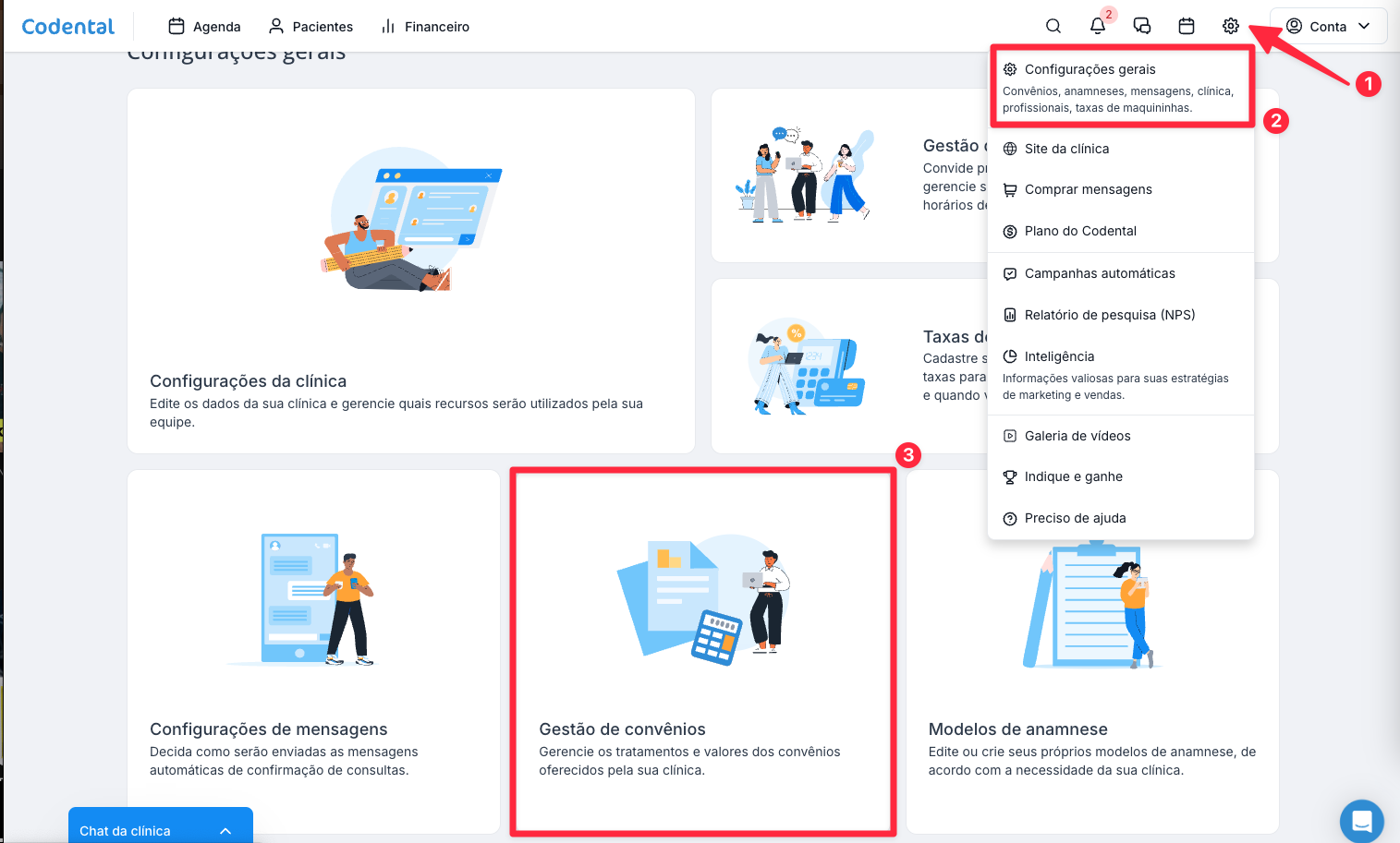 Clique no ícone de engrenagem no canto superior direito do menu principal, selecione Configurações Gerais e, em seguida, clique em Gestão de Convênios.