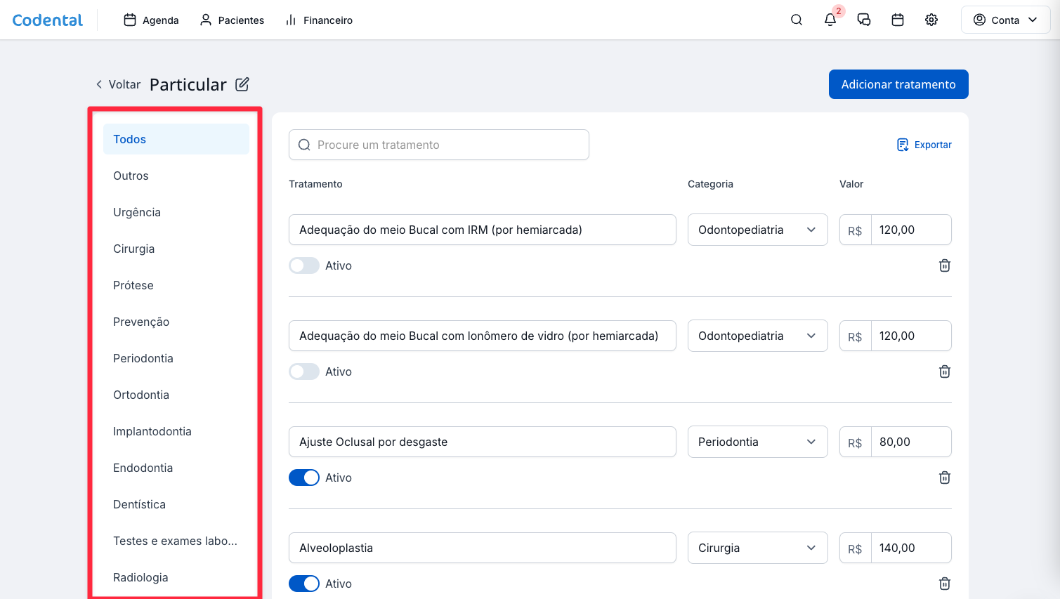 A tabela de valores da clínica é essencial para organizar os procedimentos e gerar orçamentos precisos. O Codental oferece uma tabela padrão com diversos procedimentos, mas sabemos que cada clínica tem suas particularidades. Por isso, você pode personalizar essa tabela, ajustando nomes, valores e adicionando novos tratamentos conforme suas necessidades.