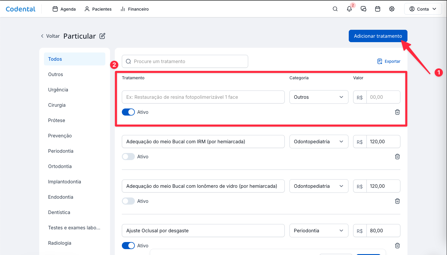 • Adicionar Procedimentos à Tabela de Valores: Clique em Adicionar tratamento para inserir uma nova linha e preencha os campos de nome, valor e categoria.