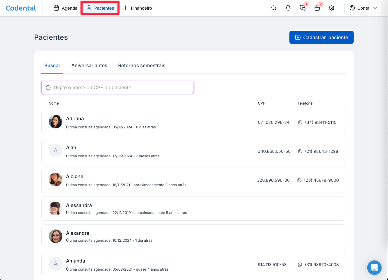 Com o Codental, localizar pacientes cadastrados é rápido e simples. Utilize o menu de pacientes para uma busca detalhada, encontre por CPF com a máscara correta ou aproveite os atalhos de teclado para agilidade máxima.