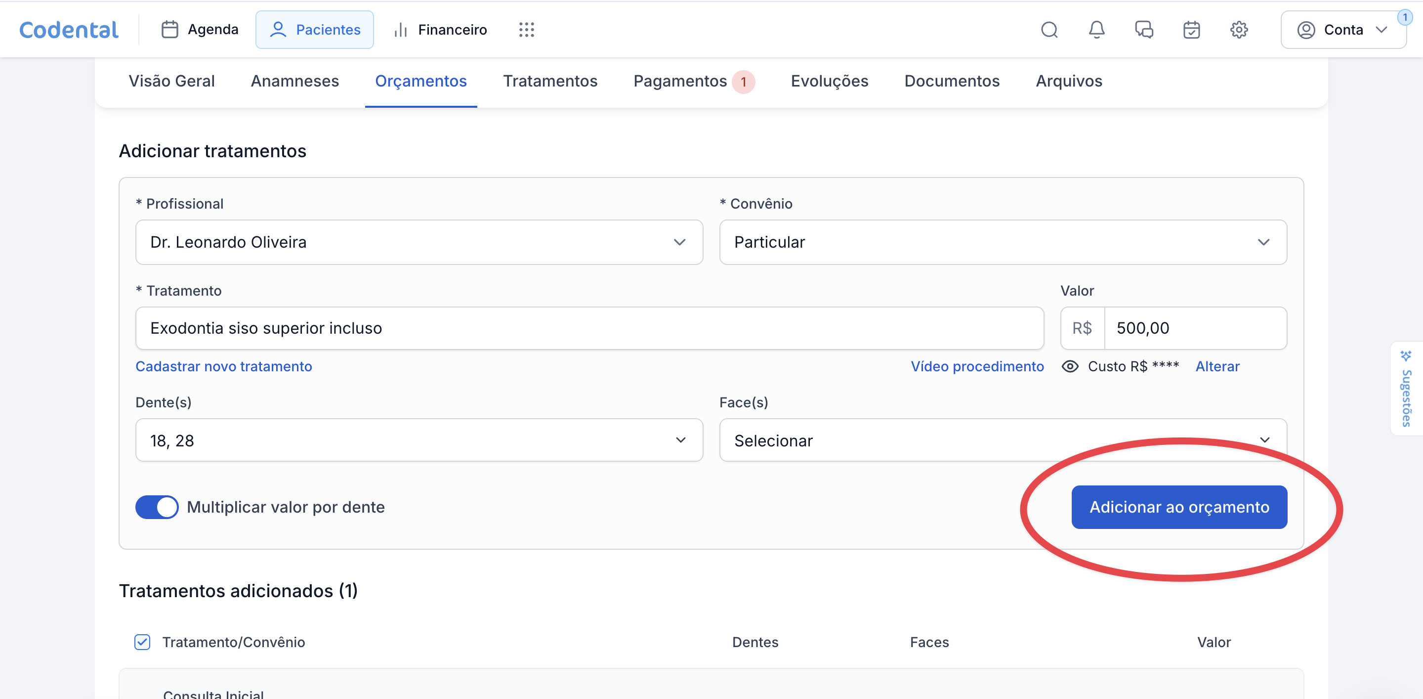 Clique em Adicionar ao orçamento. Repita o processo quantas vezes forem necessárias até adicionar todos os procedimentos a fazer.