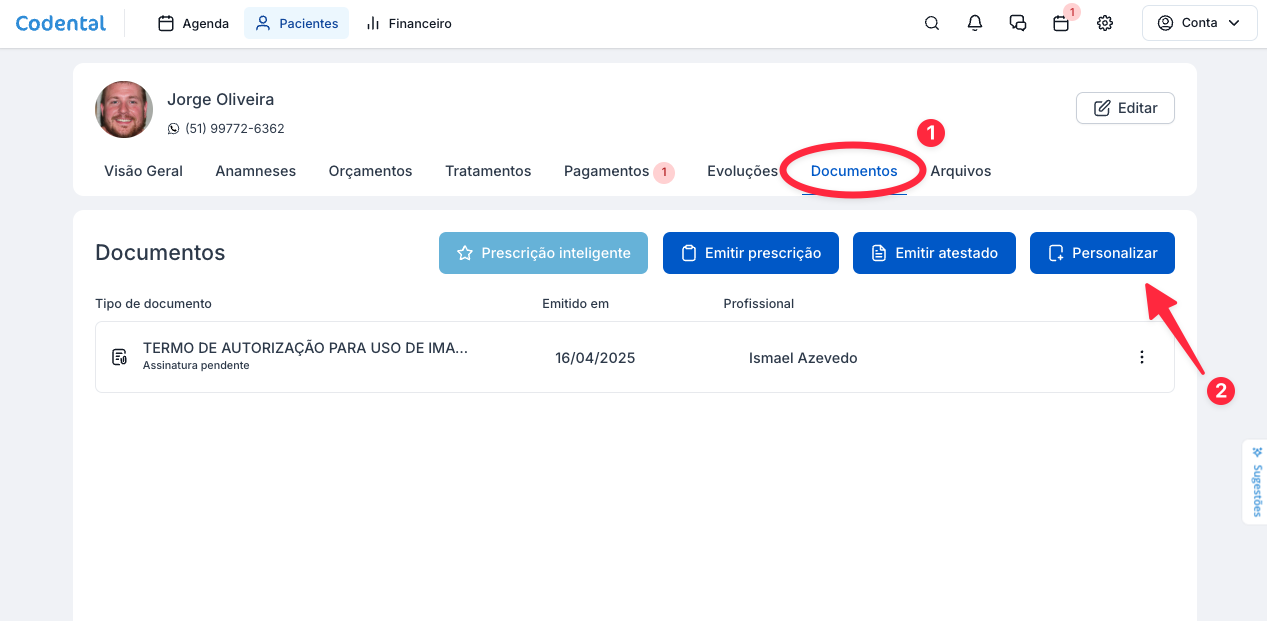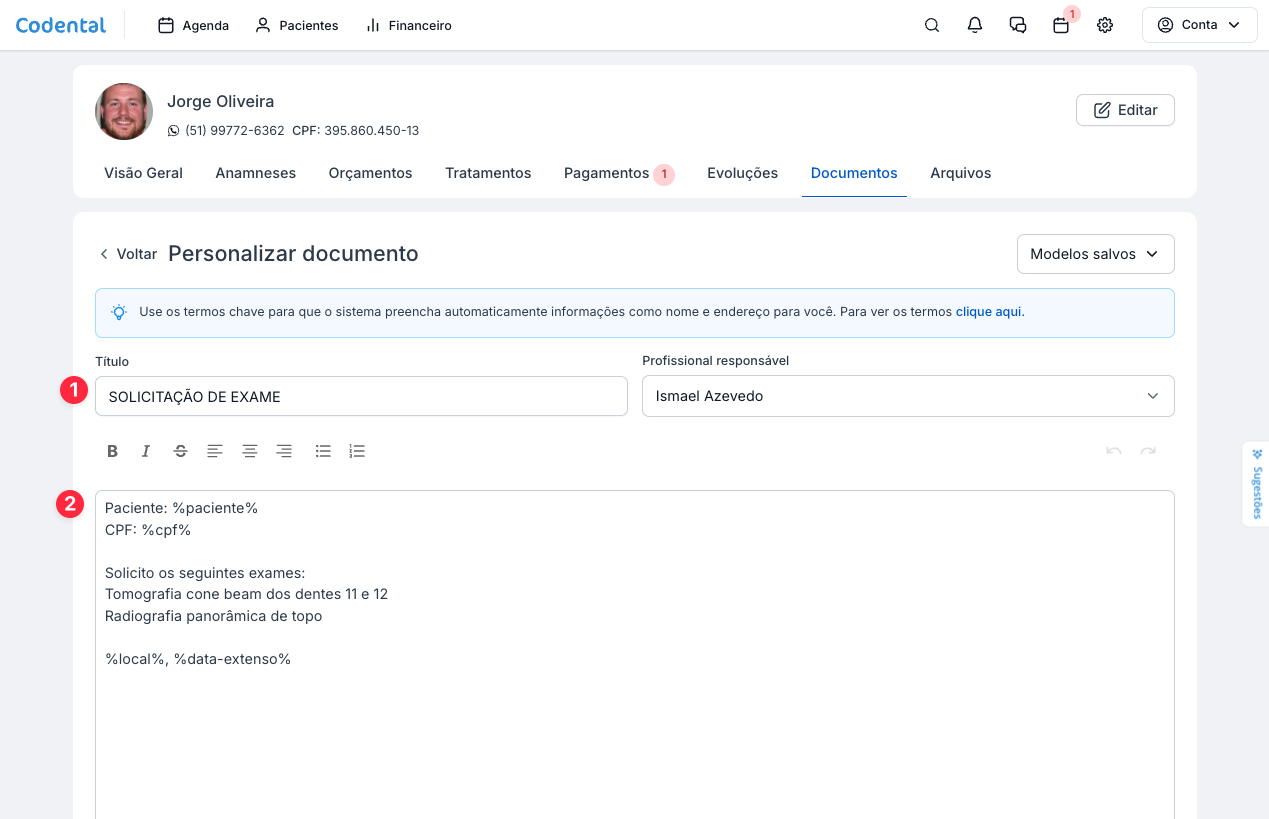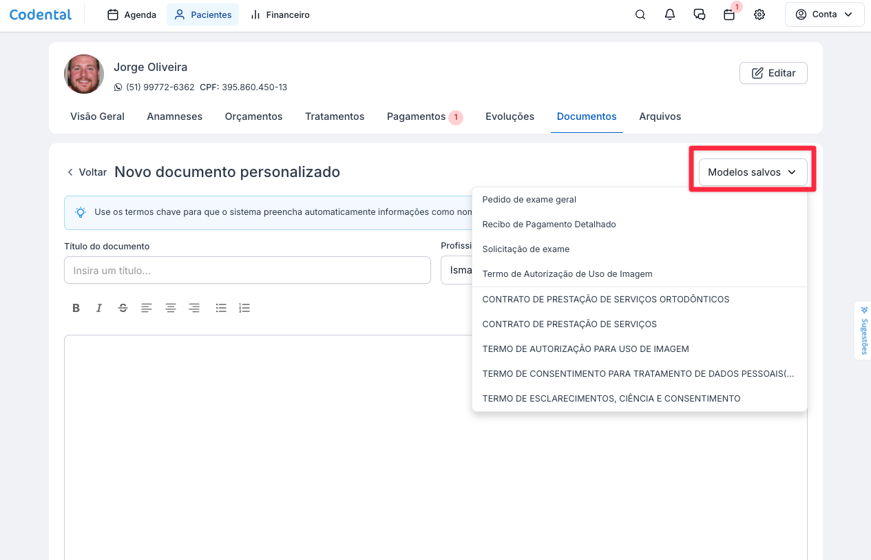 Pensando nisso, o Codental oferece uma ferramenta de criação de documentos personalizados, com campos inteligentes e possibilidade de salvar modelos para reutilizar sempre que precisar.