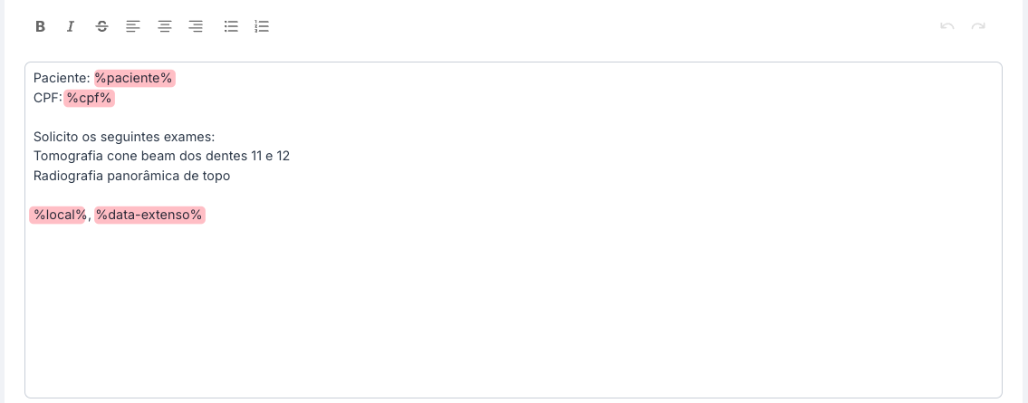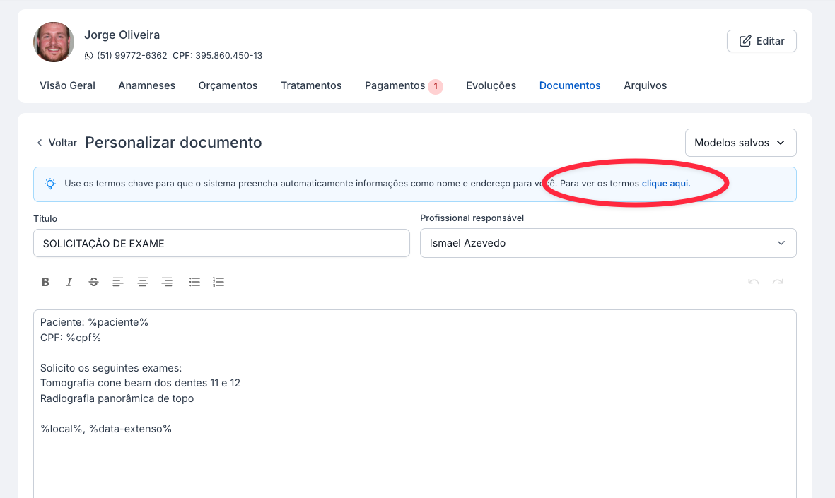 Você pode usar campos dinâmicos que serão preenchidos automaticamente com os dados do paciente, responsável, dentista ou clínica. Esses termos ajudam a padronizar os documentos e economizam tempo no preenchimento manual.