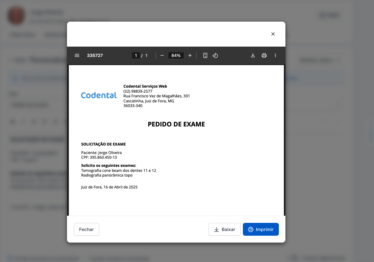 Depois de preencher tudo, clique no botão azul no canto inferior da tela para gerar o documento. O Codental já inclui automaticamente a identidade visual da clínica e os dados configurados.