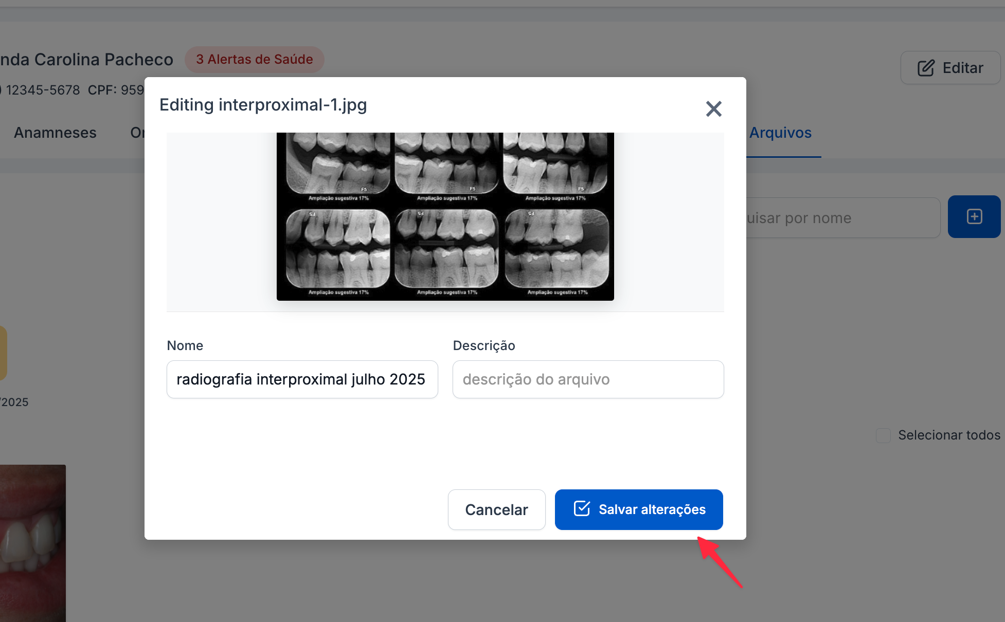 Além de nomear os arquivos corretamente, você também pode criar pastas para agrupá-los por tipo e facilitar ainda mais o manuseio durante a rotina de atendimentos. Aprenda mais em: Como Criar e Gerenciar Pastas nos Arquivos do Paciente.
