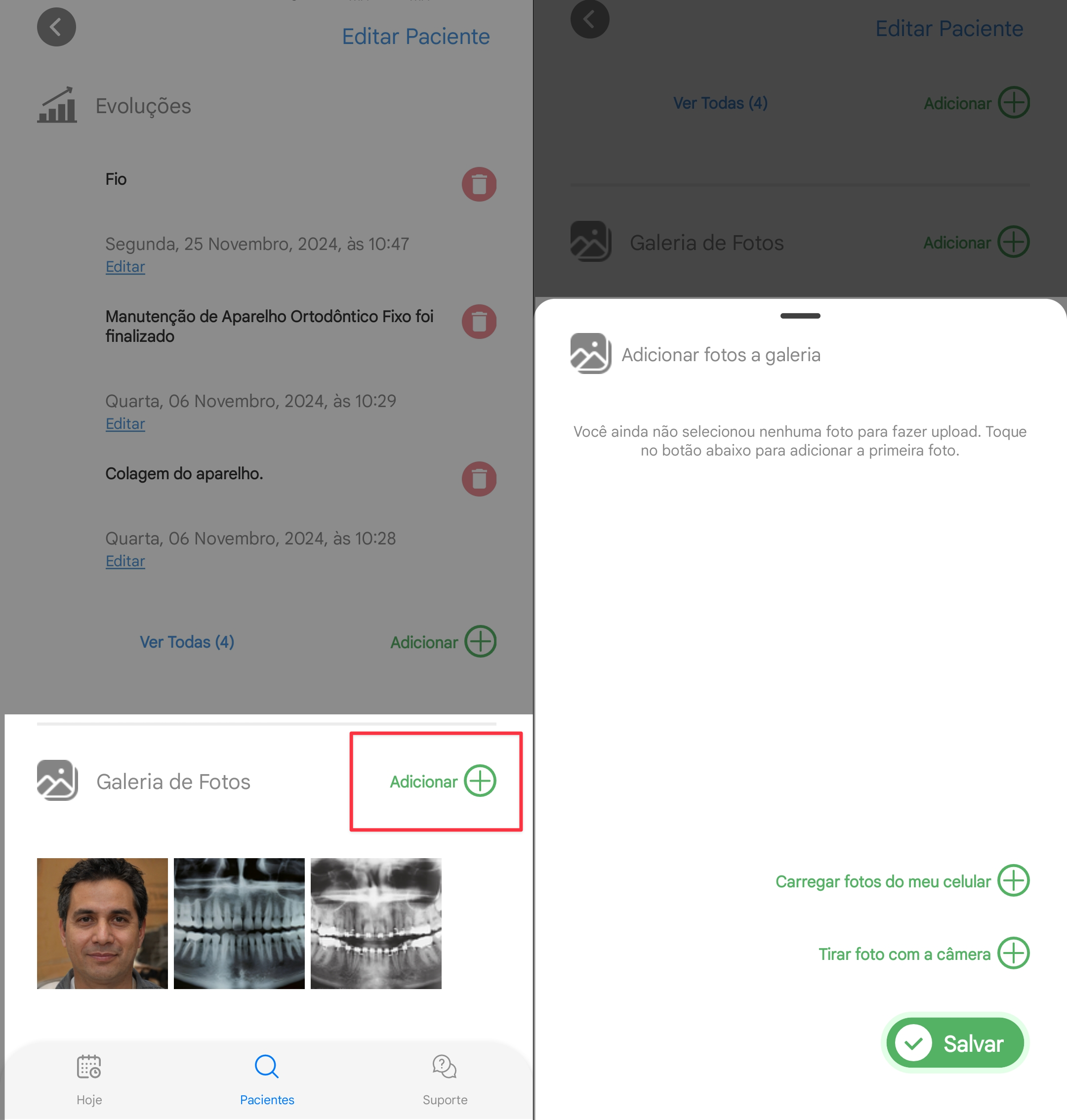 Você terá duas opções para adicionar fotos ao prontuário do paciente: