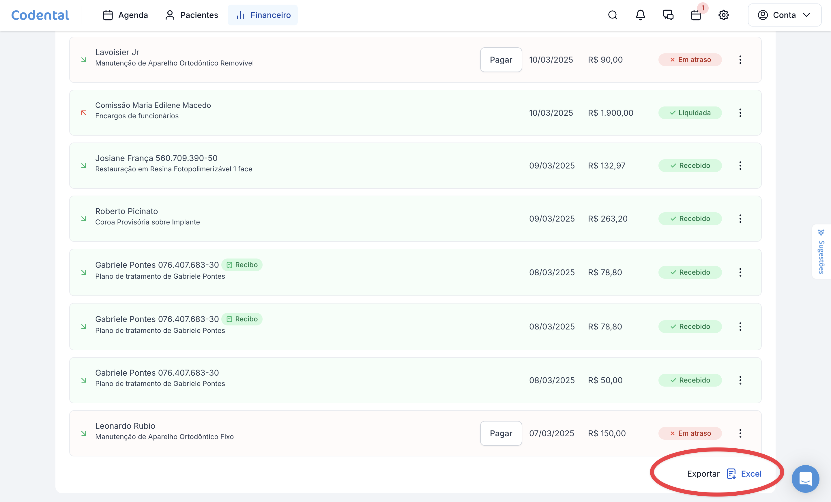 O Codental permite filtrar as informações por datas, dentistas, status de pagamento, entre outras opções. Dessa forma, você consegue exportar somente os dados que deseja analisar mais a fundo. Saiba como aplicar filtros no fluxo de caixa neste artigo.
