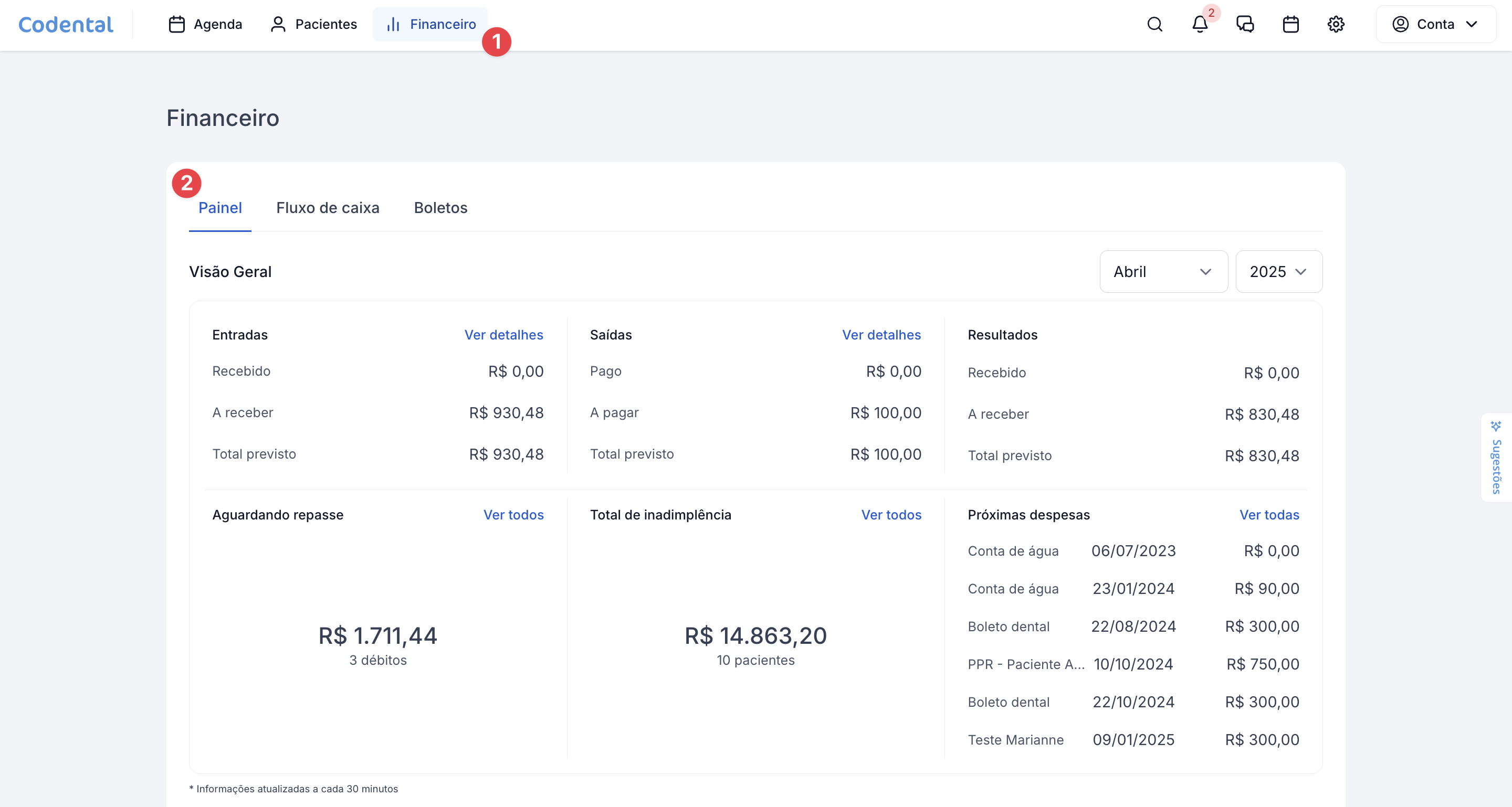 Para começar, entre no menu Financeiro e depois vá em Painel. Aqui, você encontra todos os dados referentes às entradas, saídas e o desempenho financeiro da clínica.