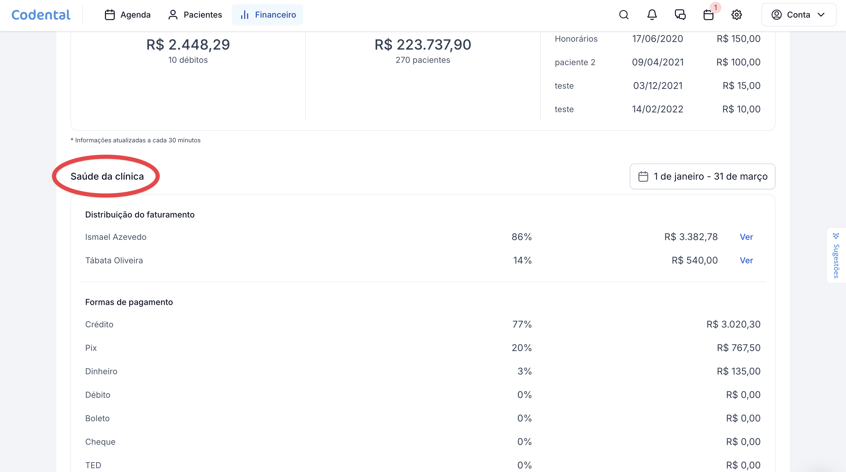 Descendo a página, você chegará à seção Saúde da Clínica, onde está a Distribuição do Faturamento. É nessa parte que você confere o quanto cada dentista faturou no período desejado.