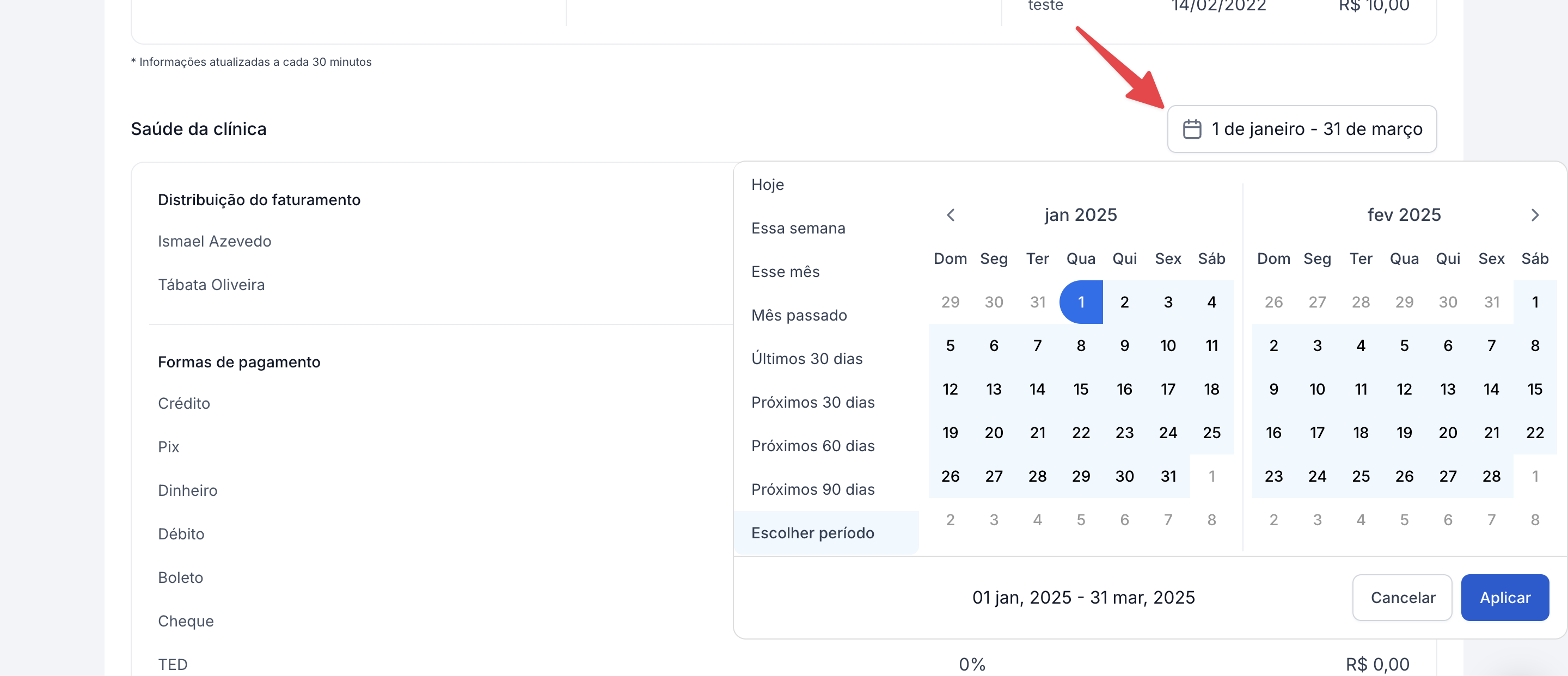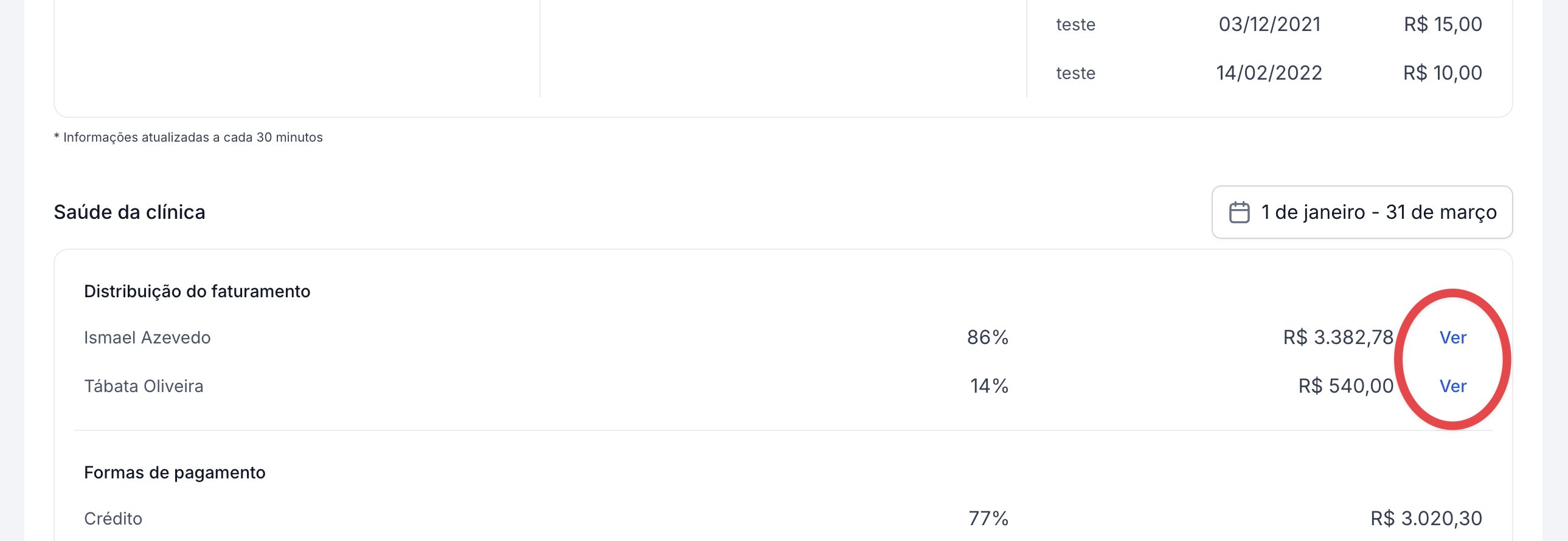 2. Vá até “Saúde da Clínica” e Distribuição de Faturamento