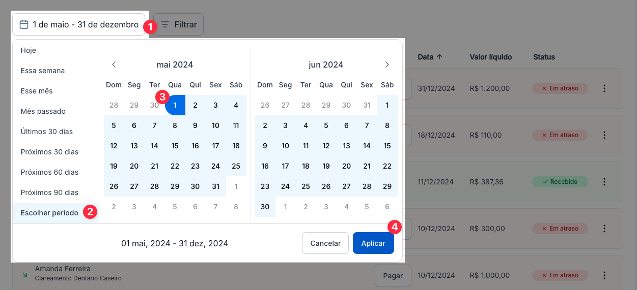 Além do período, você pode filtrar informações específicas utilizando os filtros avançados ao lado da seleção de datas.