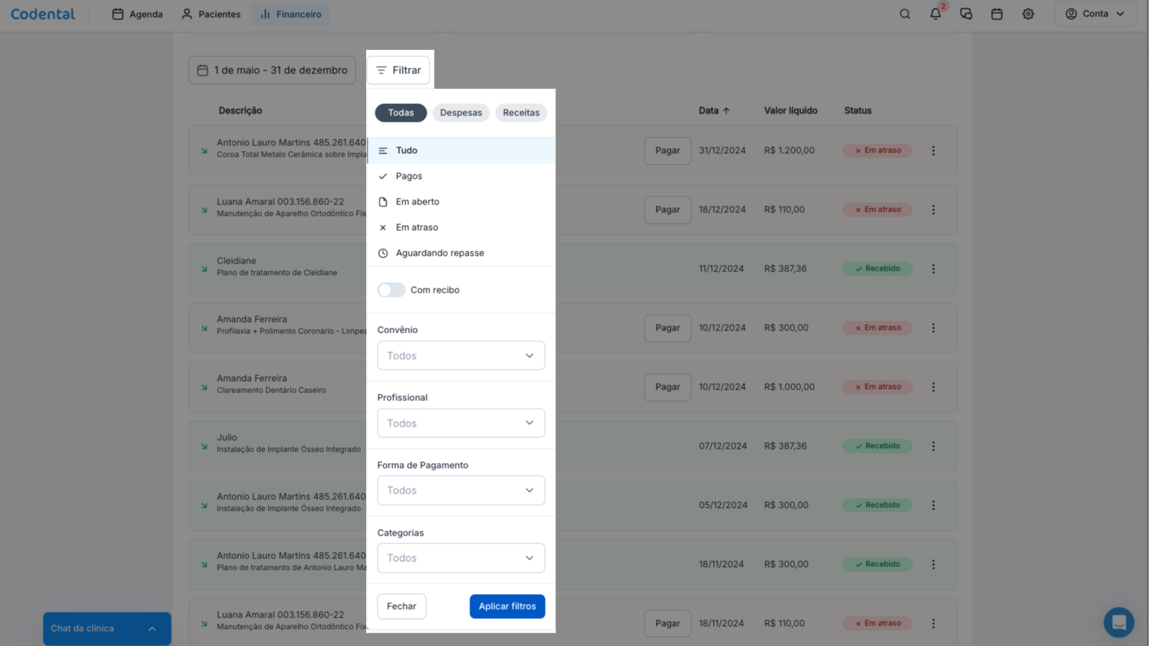 Com os filtros do Fluxo de Caixa no Codental, você ganha controle total sobre as informações financeiras da sua clínica. Personalize a visualização conforme suas necessidades, exporte relatórios detalhados e simplifique a gestão financeira diária. O Codental está aqui para facilitar o seu dia a dia!