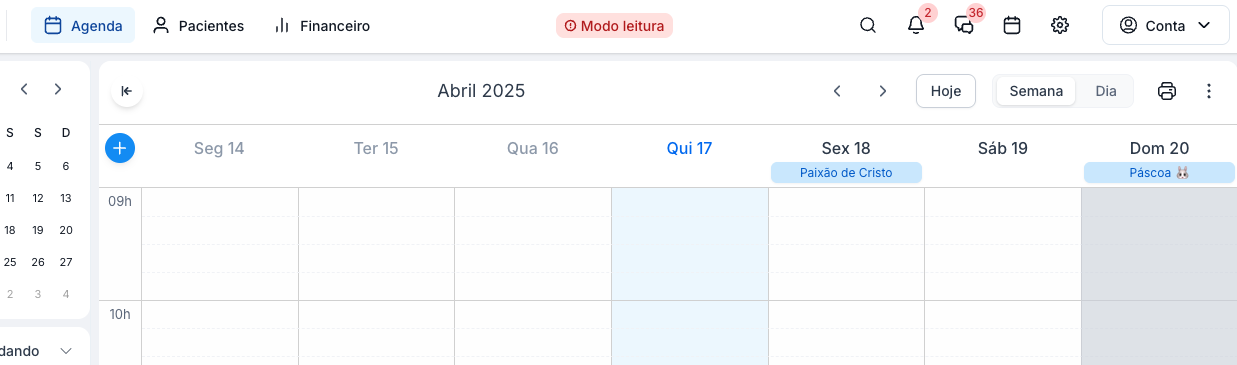 Nesse modo, o sistema fica bloqueado para alterações e não é possível agendar consultas, editar prontuários ou fazer lançamentos financeiros.