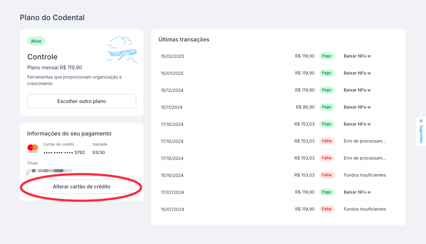 Assim que o novo cartão for registrado, o sistema tentará realizar a cobrança pendente automaticamente. Se tudo der certo, o acesso é liberado na hora.