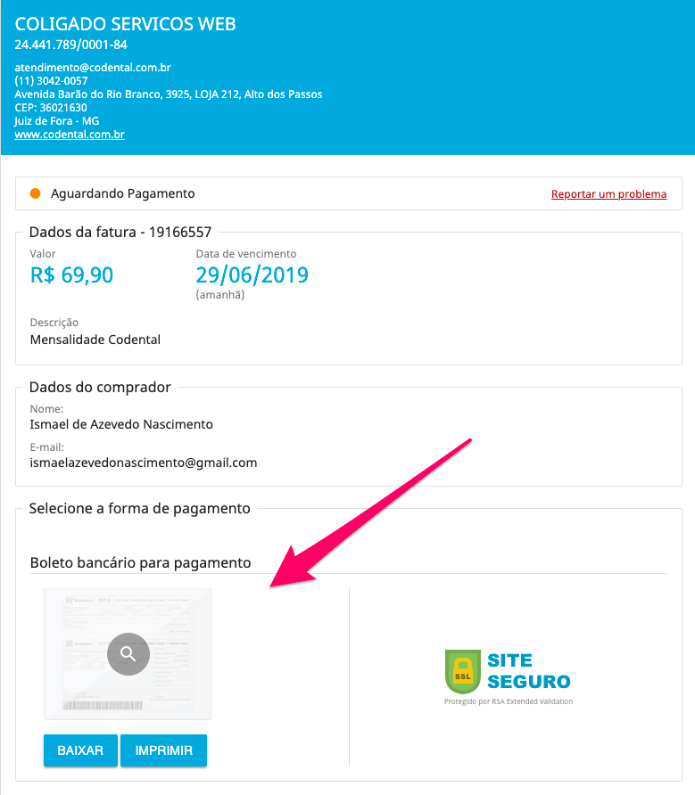 Clique em Baixar ou Imprimir Boleto para atualizar a data.