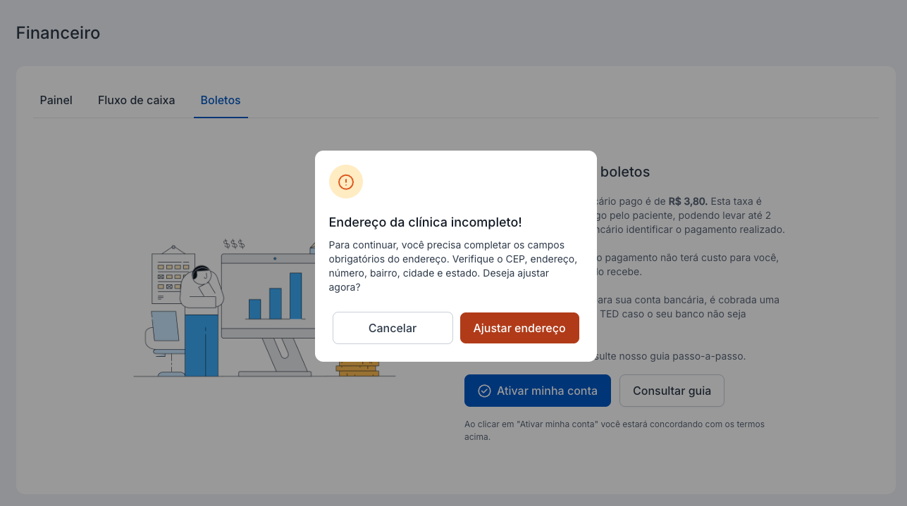 Caso o endereço da clínica esteja incompleto, o sistema vai solicitar que você preencha ele primeiro. É só clicar em Ajustar endereço para completar os dados. Caso não apareça, pule para o passo 2.