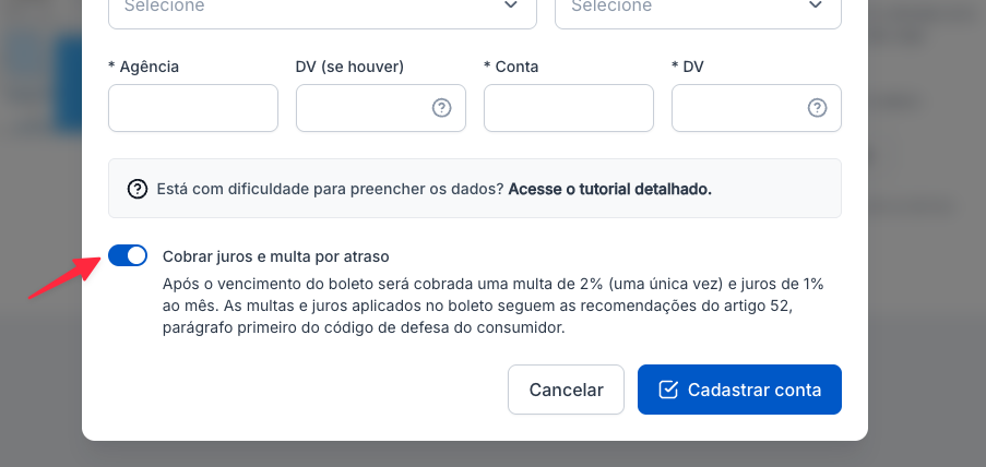 Após preencher os dados conforme o formulário, você pode definir se quer ativar ou não a multa e juros para boletos vencidos.