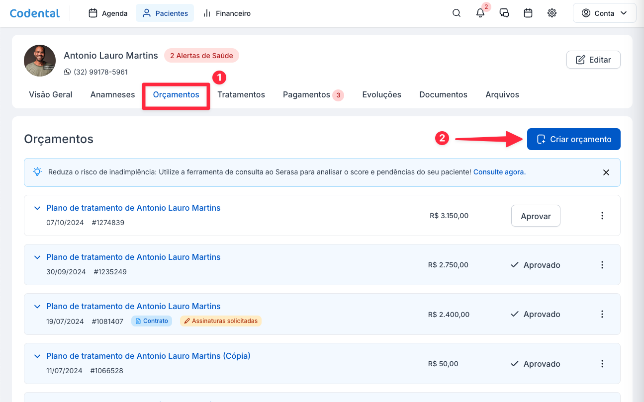 Para aprender mais sobre como criar orçamentos, leia: Como criar orçamentos no Codental.