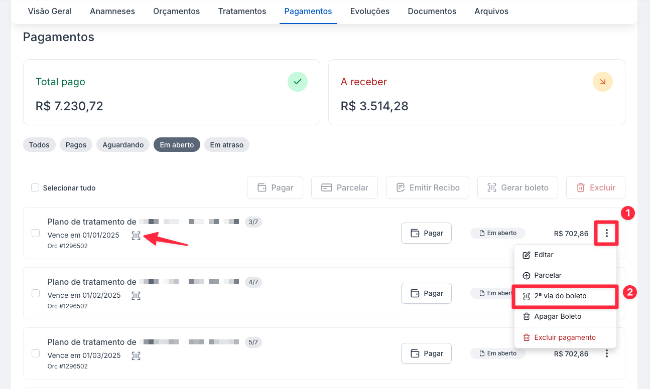 Os pagamentos que tiverem boletos gerados ficarão sinalizados com o ícone de código de barras ao lado, facilitando a identificação. Caso precise emitir uma segunda via, basta clicar sobre este ícone ou no menu de opções e depois "Segunda via de boleto".