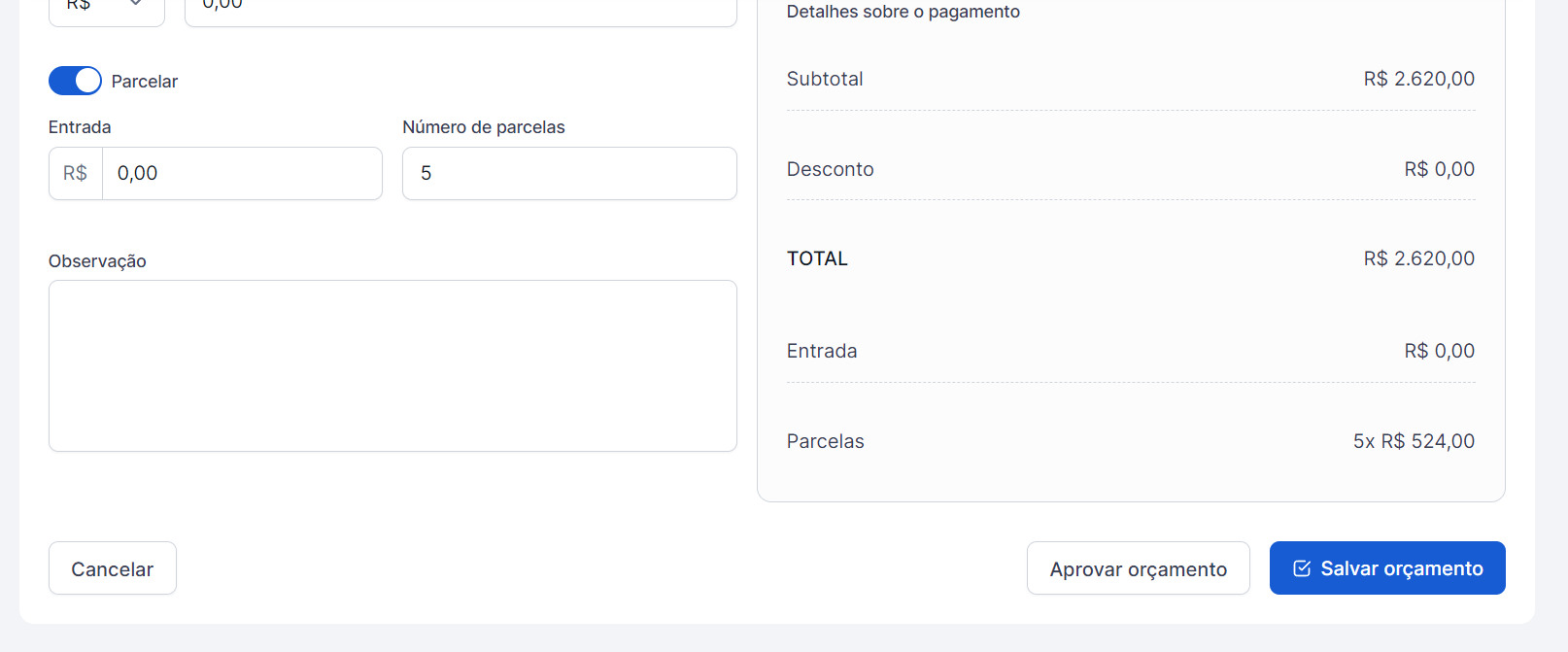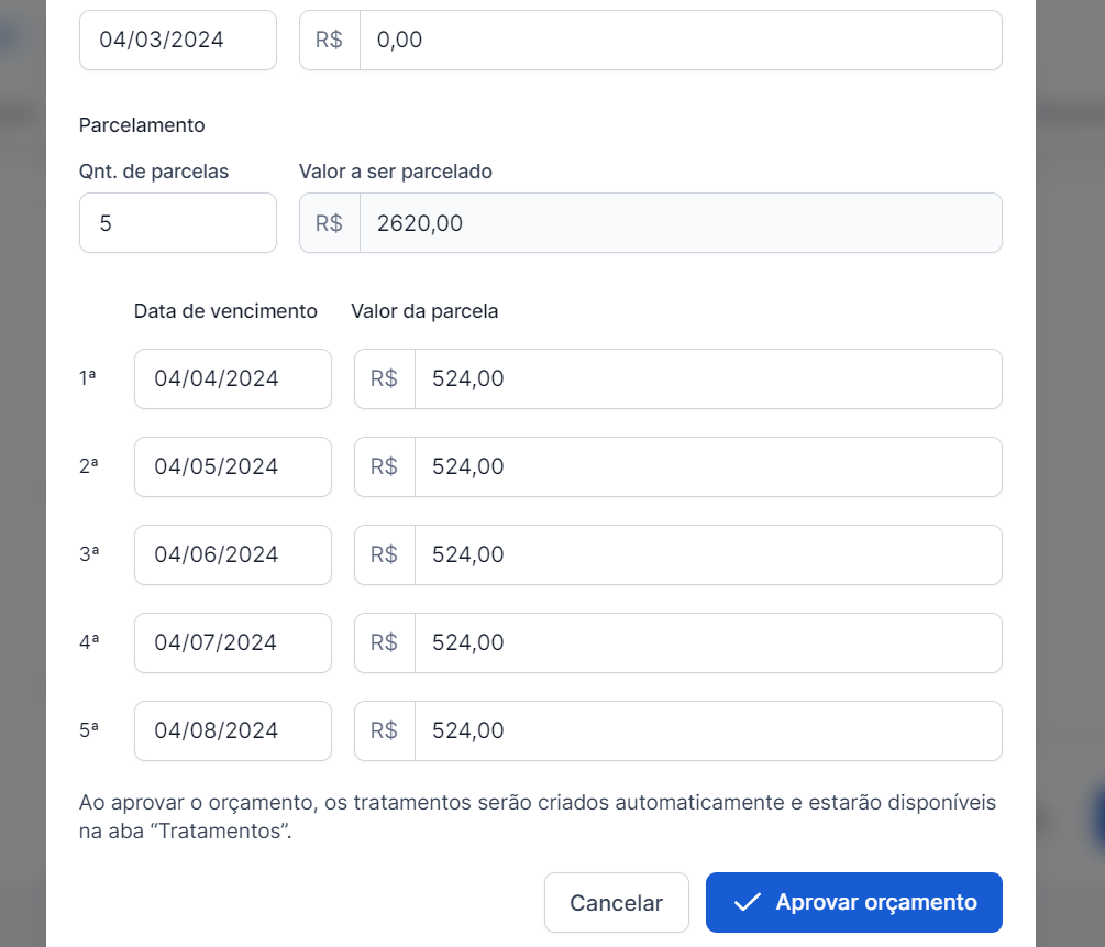 Adicione os tratamentos desejados e ative a opção de parcelamento.
