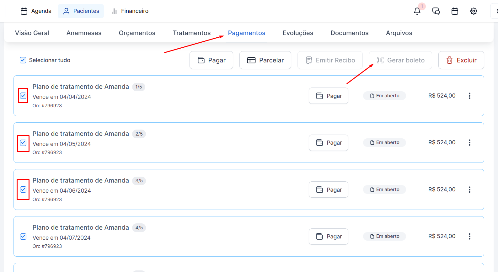 Acesse a aba Pagamentos, se preferir filtre somente pelos pagamentos "Em aberto", depois selecione as parcelas desejadas e clique em "Gerar Boletos".