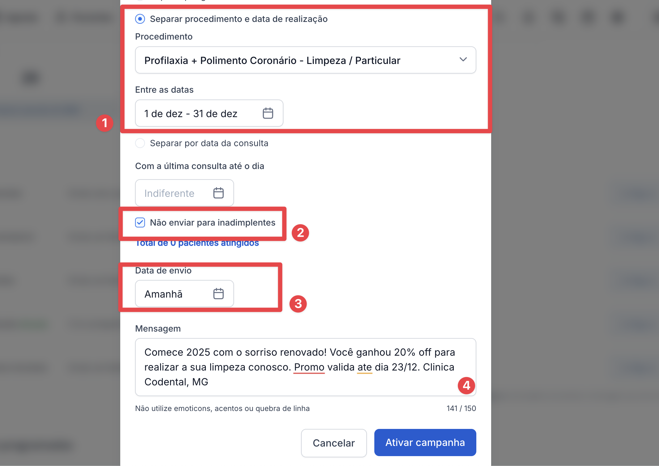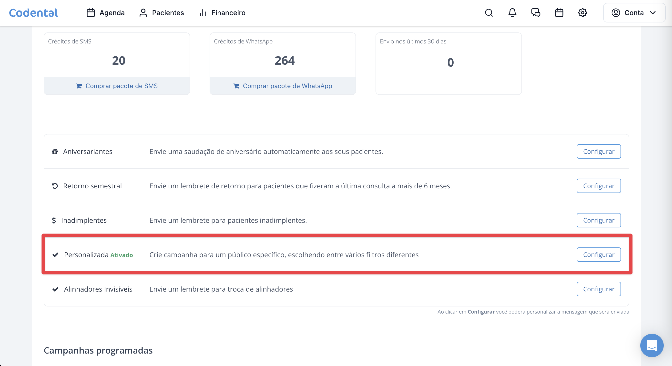 Dica: Antes de ativar a campanha, certifique-se de que tem saldo suficiente para o envio. O Codental exibe automaticamente o número de mensagens necessárias.
