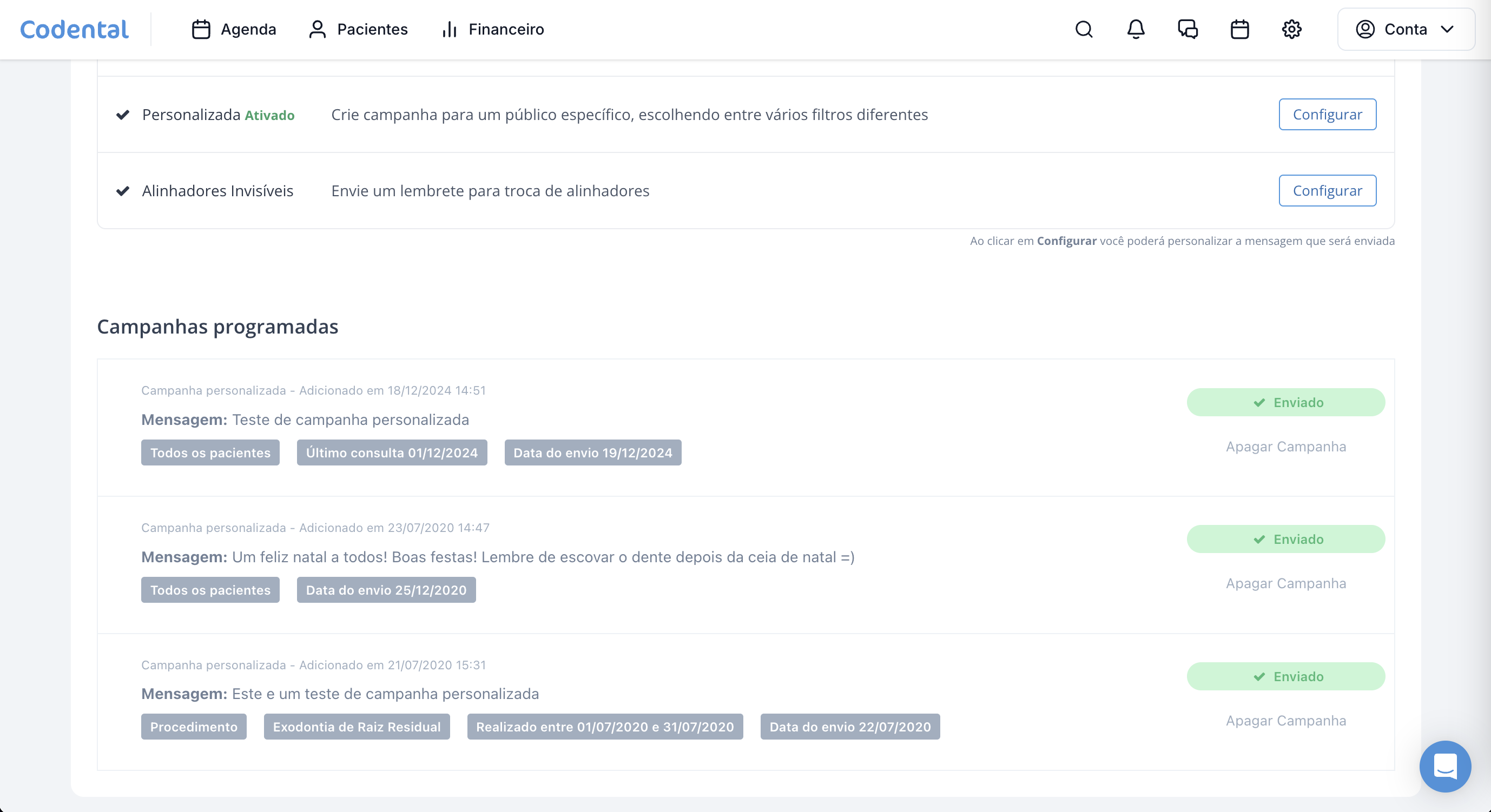 As campanhas personalizadas do Codental oferecem uma solução poderosa para melhorar a comunicação com seus pacientes e aumentar o sucesso das suas iniciativas de marketing. Seja para promover tratamentos, reativar pacientes ou enviar mensagens gerais, você tem total controle para criar campanhas eficazes e direcionadas.