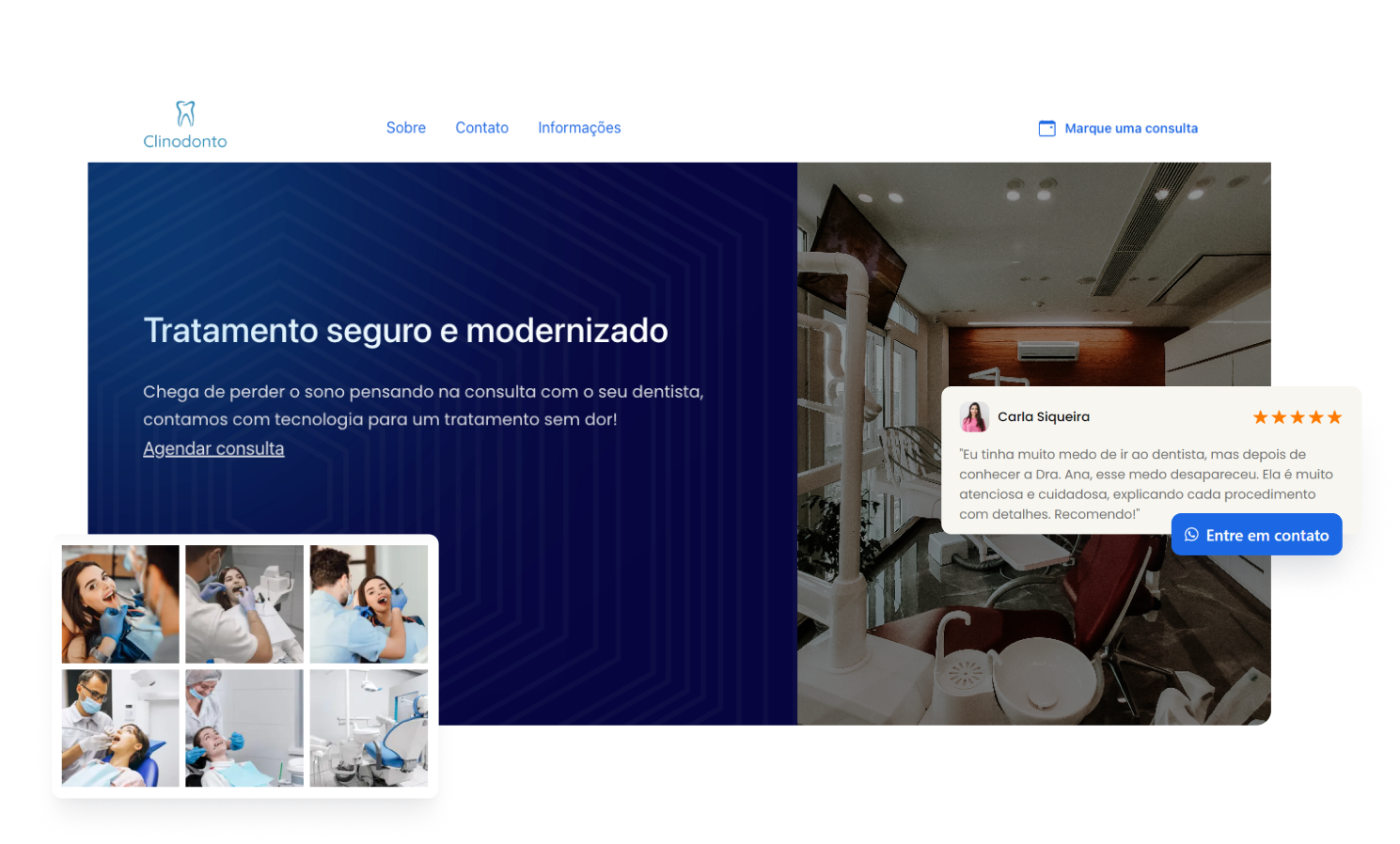 Ter um site institucional é mais do que uma tendência — é uma necessidade no mundo digital de hoje. Com o site da clínica no Codental, você elimina os custos e a complexidade de gerenciar um site, enquanto aproveita uma ferramenta integrada que atrai pacientes e facilita o agendamento.