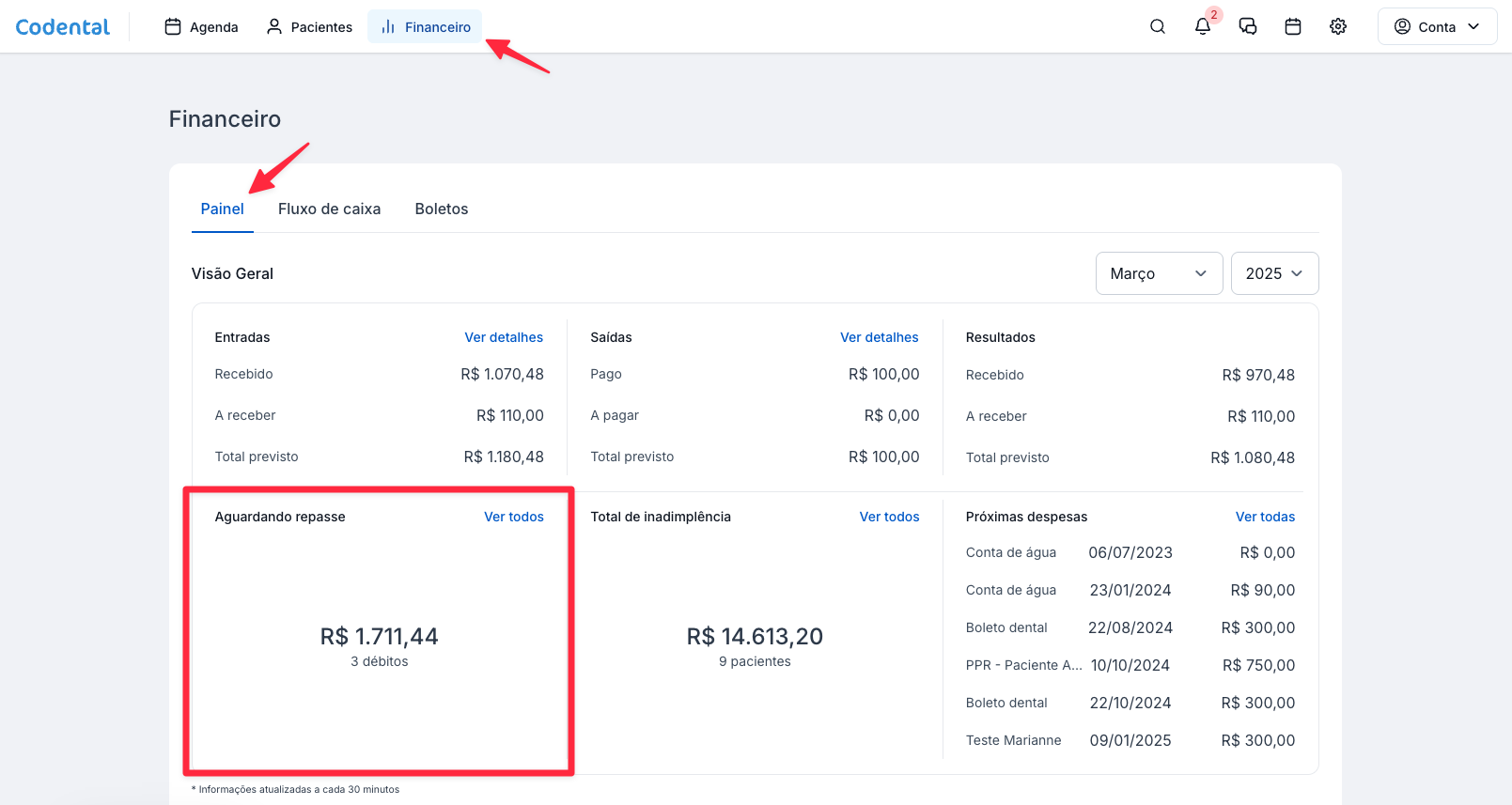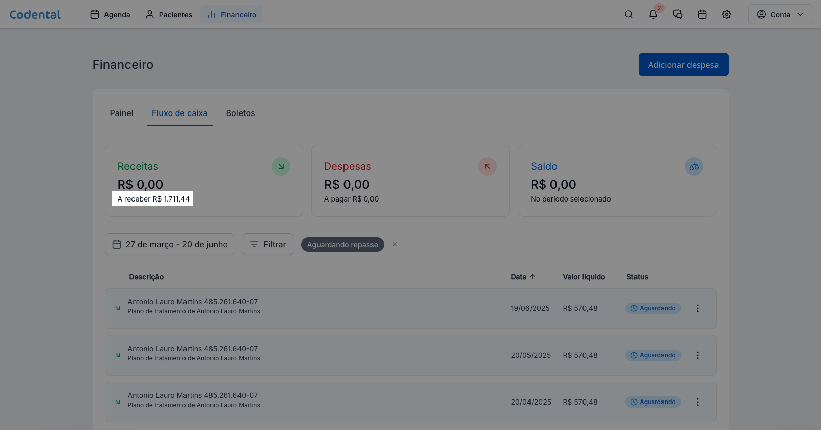 Mantenha o controle dos repasses do cartão de crédito. Verifique datas de pagamento e atualize seu financeiro no fluxo de caixa do Codental.