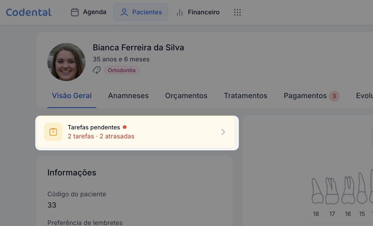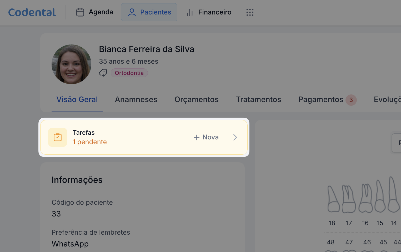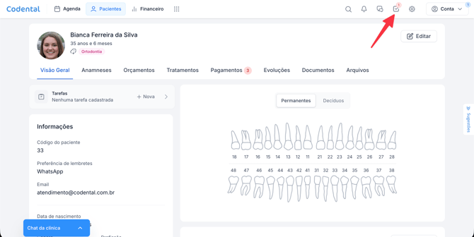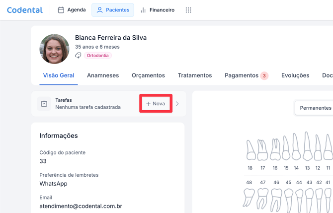 Pensando nisso, o Codental oferece uma área completa de tarefas, que permite registrar tudo rapidamente, organizar depois e acompanhar a execução pela equipe no dia a dia da clínica.