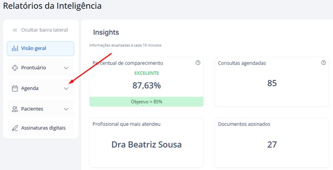 - Na coluna da esquerda, você verá as categorias de relatórios. Clique em Agenda para expandir as opções.